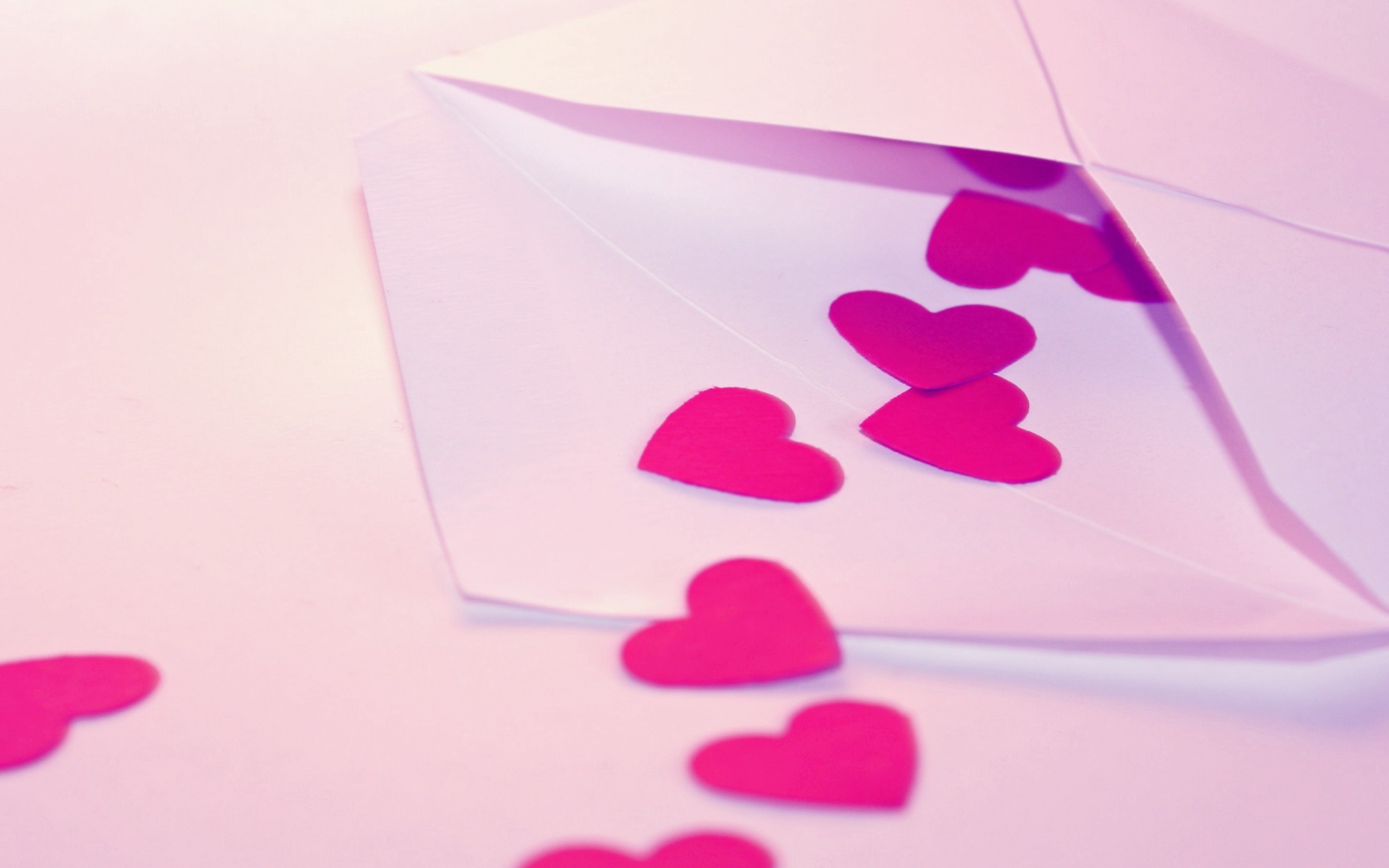 Description: A paper envelope with hearts on it and a piece of paper cut out of it to form a heart.