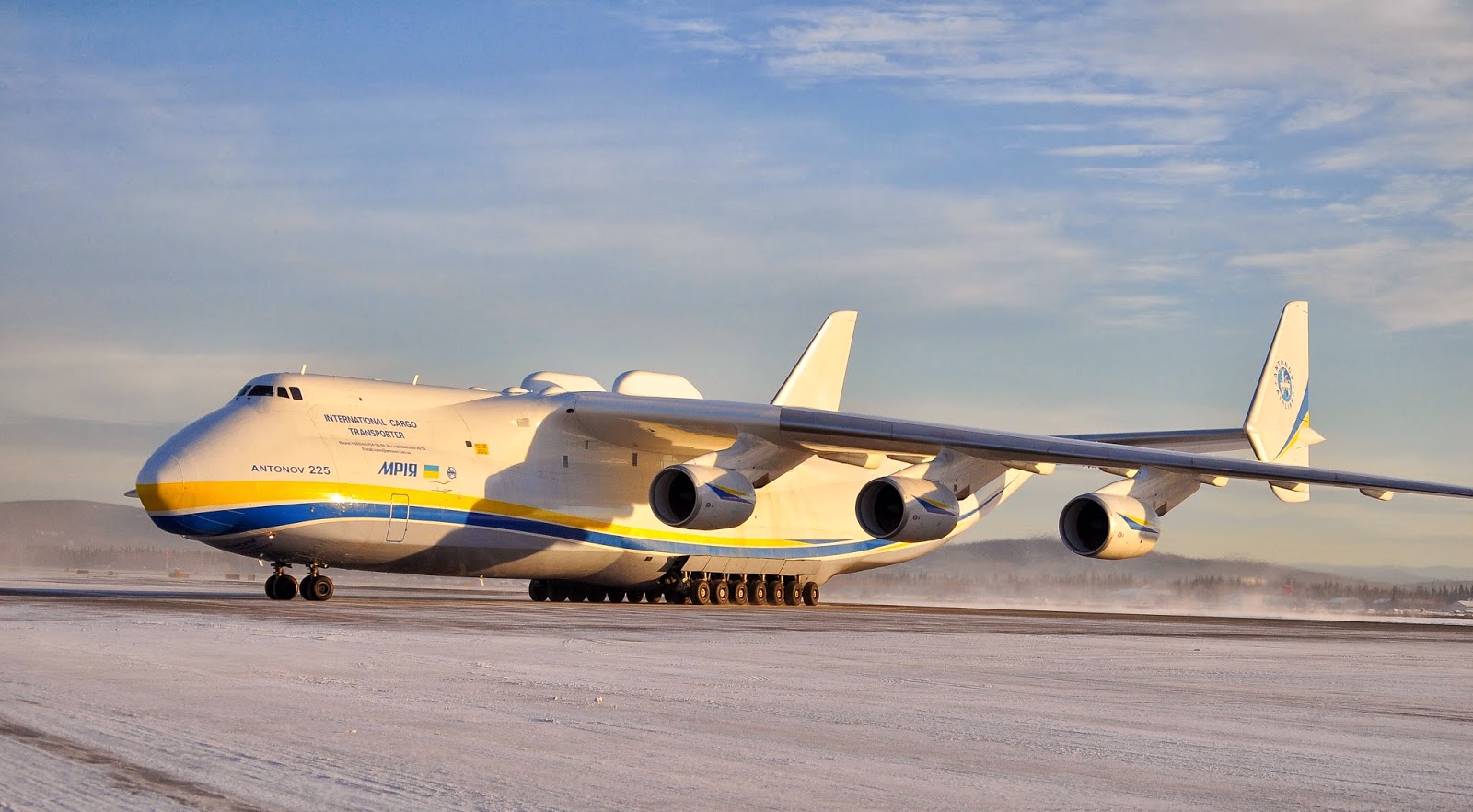 Description: A large jetliner sitting on top of an airport runway next to a mountain range in the background with a sky filled with clouds.