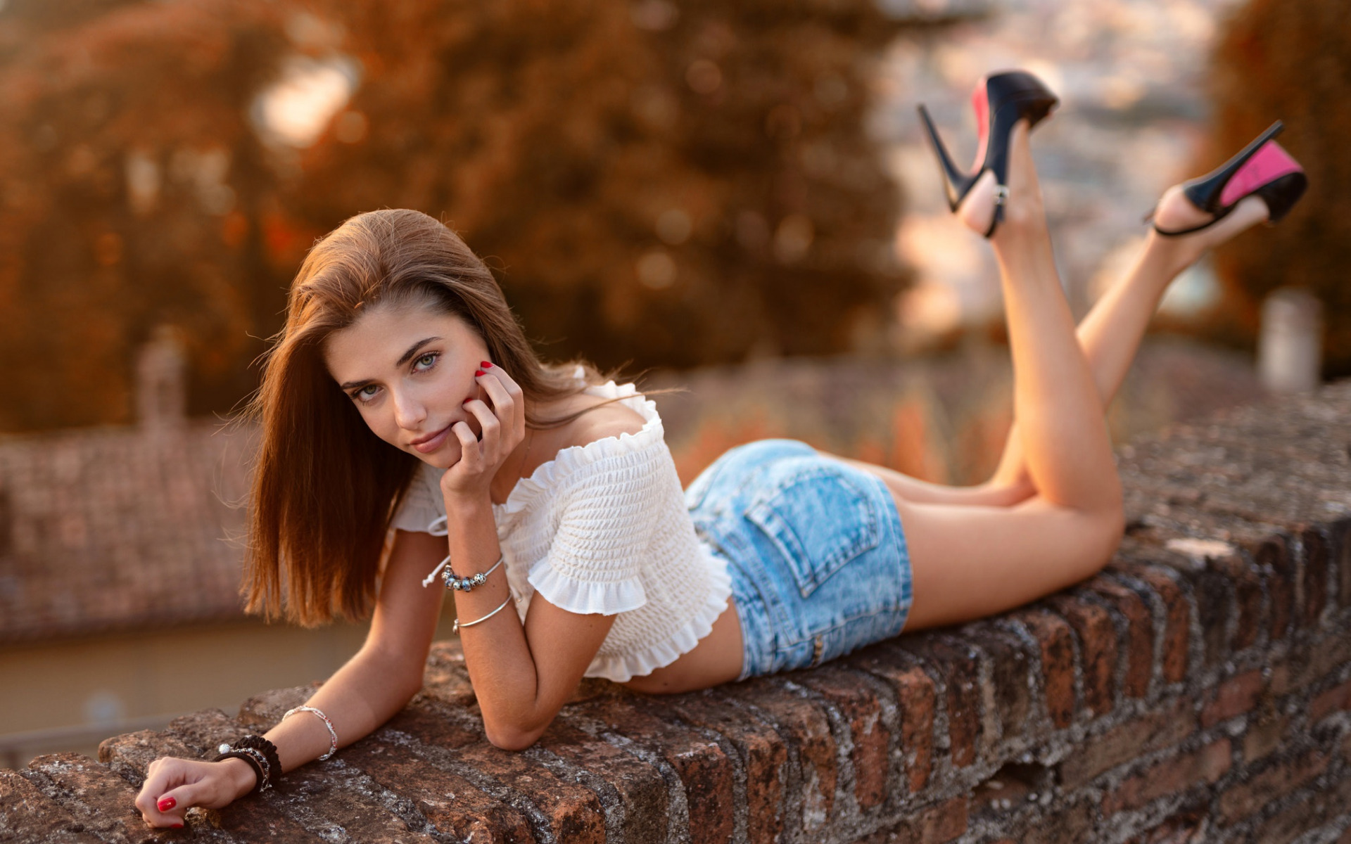 Description: A woman laying on a brick wall talking on a cell phone and holding a pair of heels in her hand.