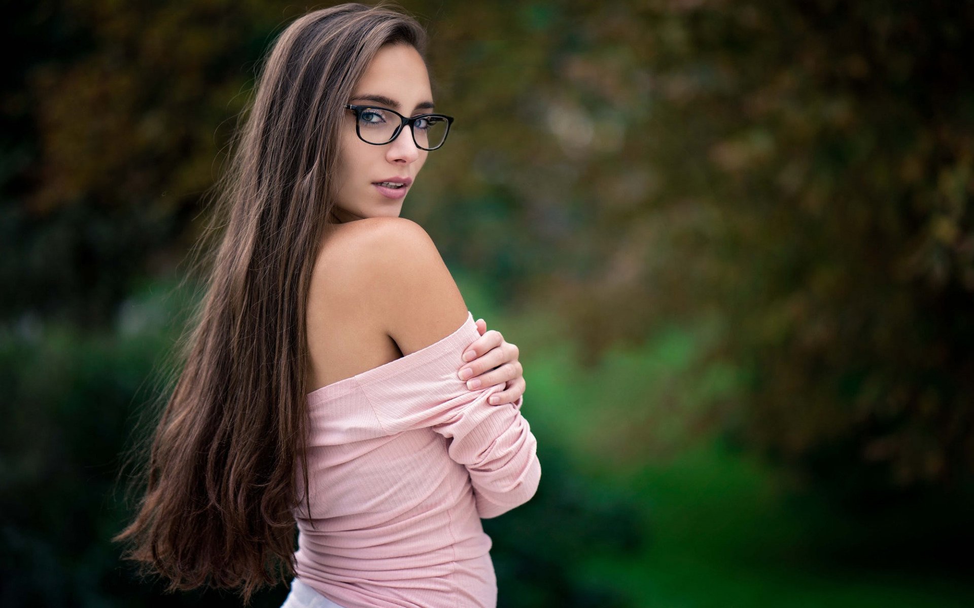 Description: A woman with glasses is posing for a picture in a park with trees in the background and a green grass area.