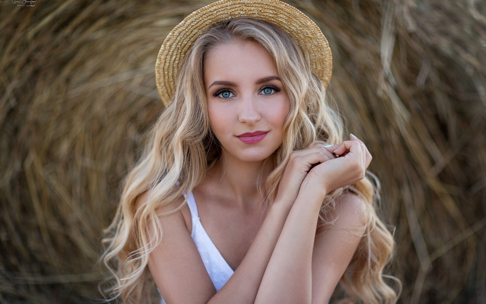 Description: A woman with a straw hat posing for a picture in front of a hay field with her hands on her chest.