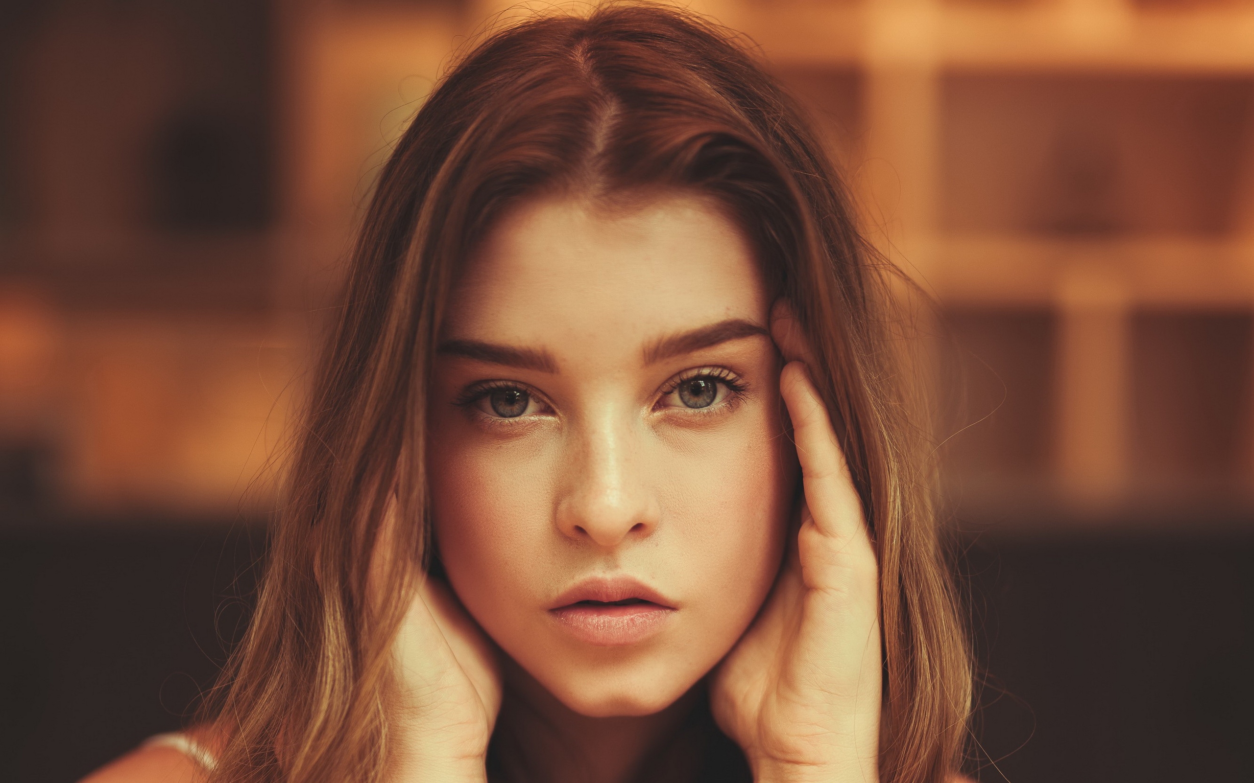 Description: A woman with long hair and a white shirt is holding her hands to her face and looking at the camera.
