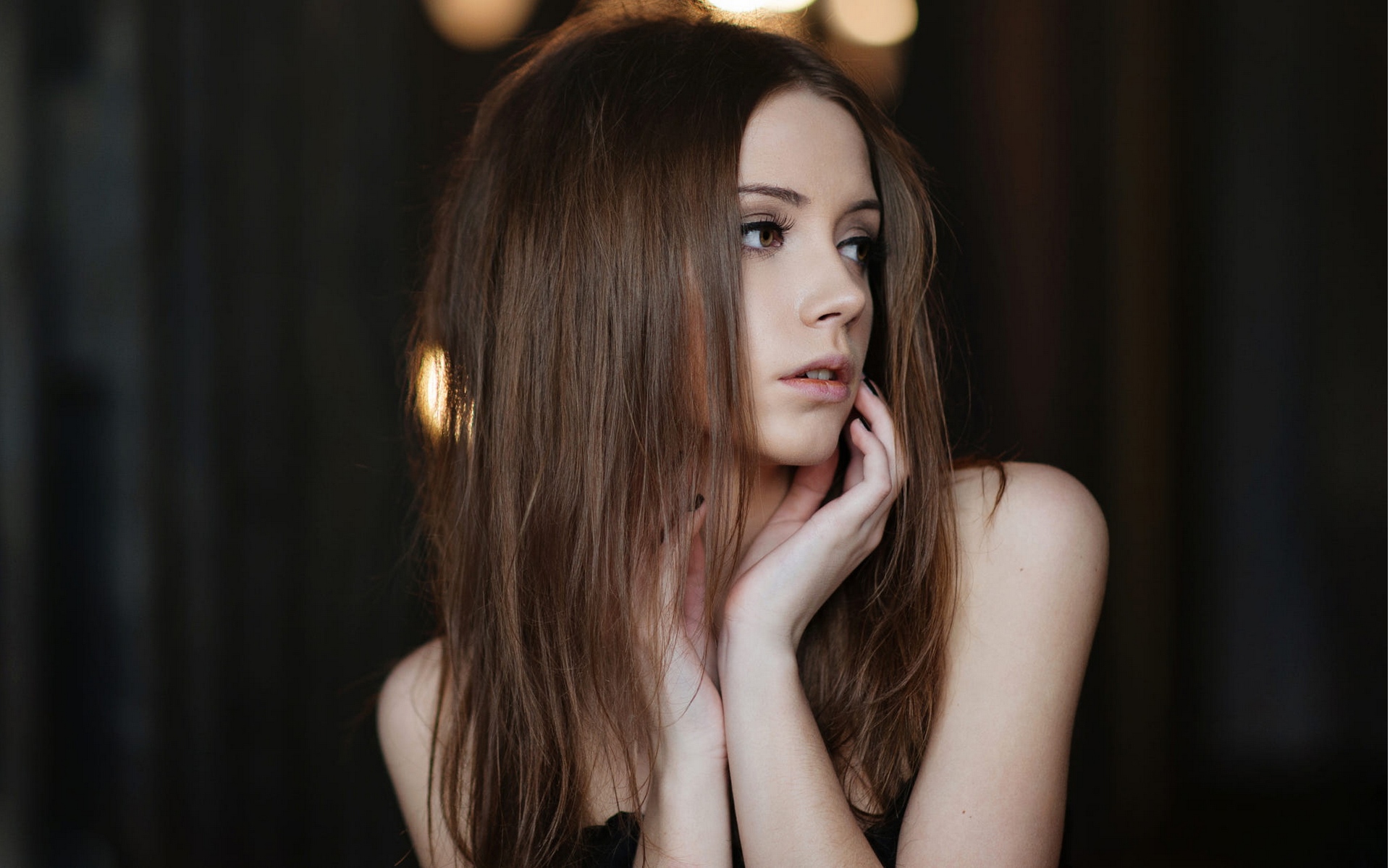 Description: A woman with long hair is posing for a picture with her hands on her face and her hand on her chin.