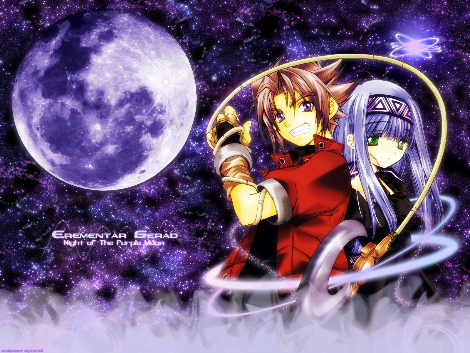 Description: Two anime characters in front of a full moon and stars background with the words.