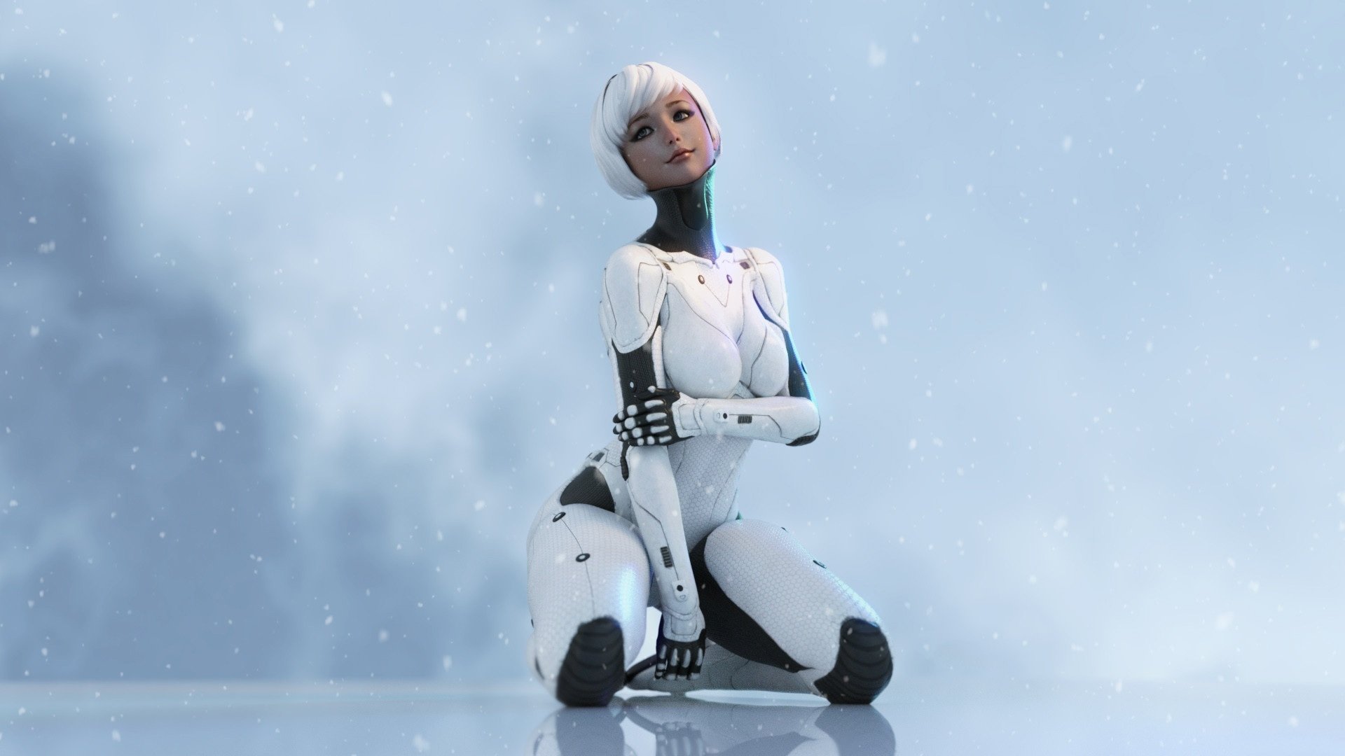 Description: A woman in a white suit and a white helmet is standing in the snow with her arms crossed and legs crossed.