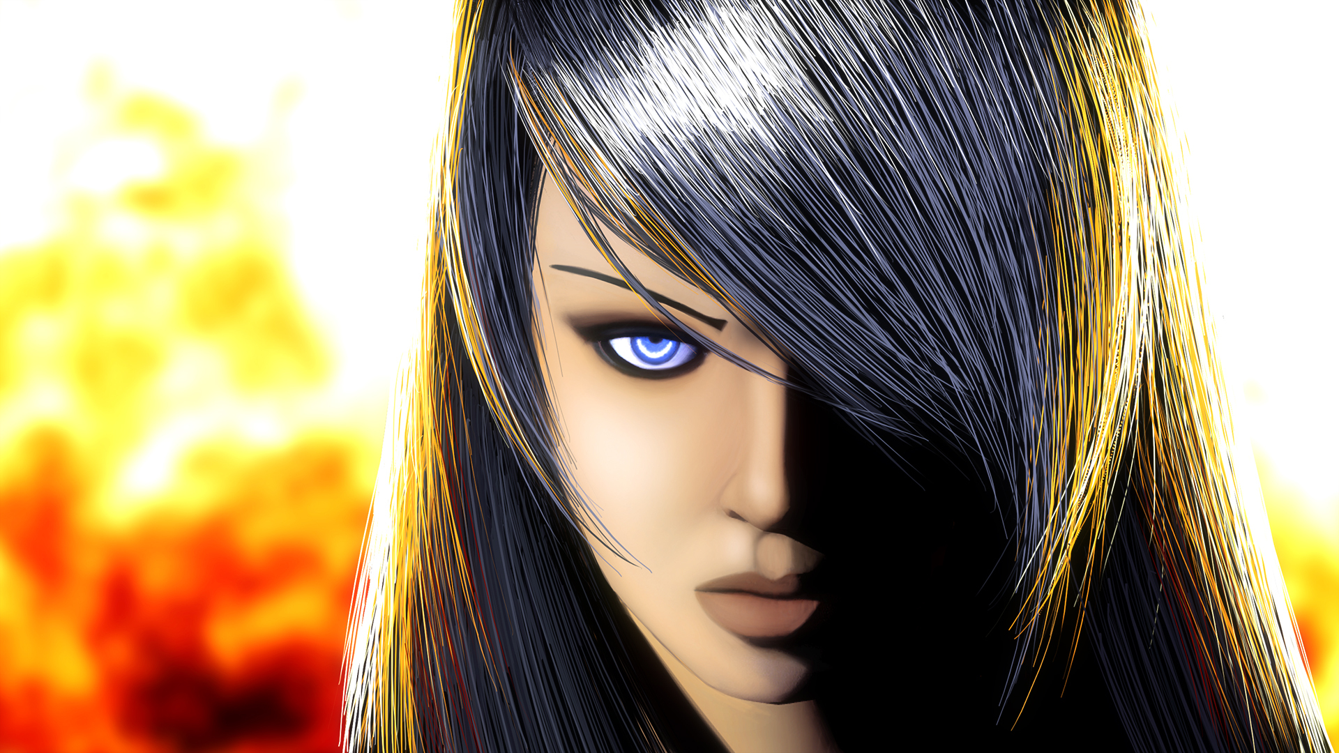 Description: A woman with blue eyes and long black hair with yellow streaks on her head and a red fire behind her.