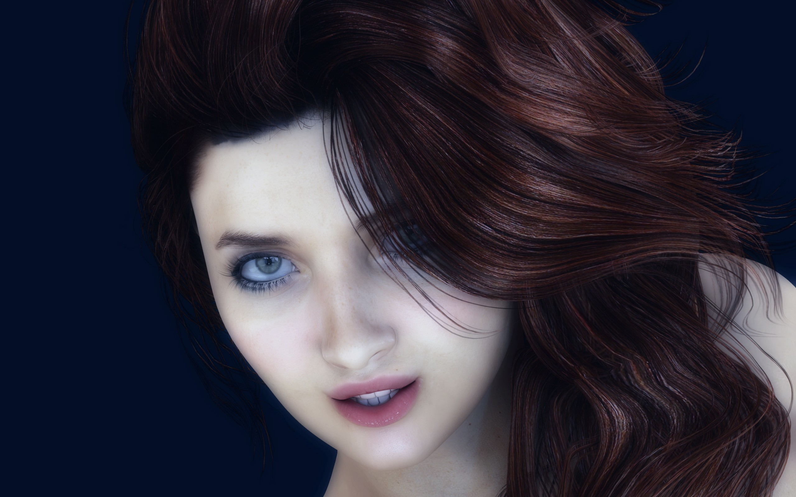 Description: A woman with blue eyes and long hair is posing for a picture with her hair blowing in the wind.