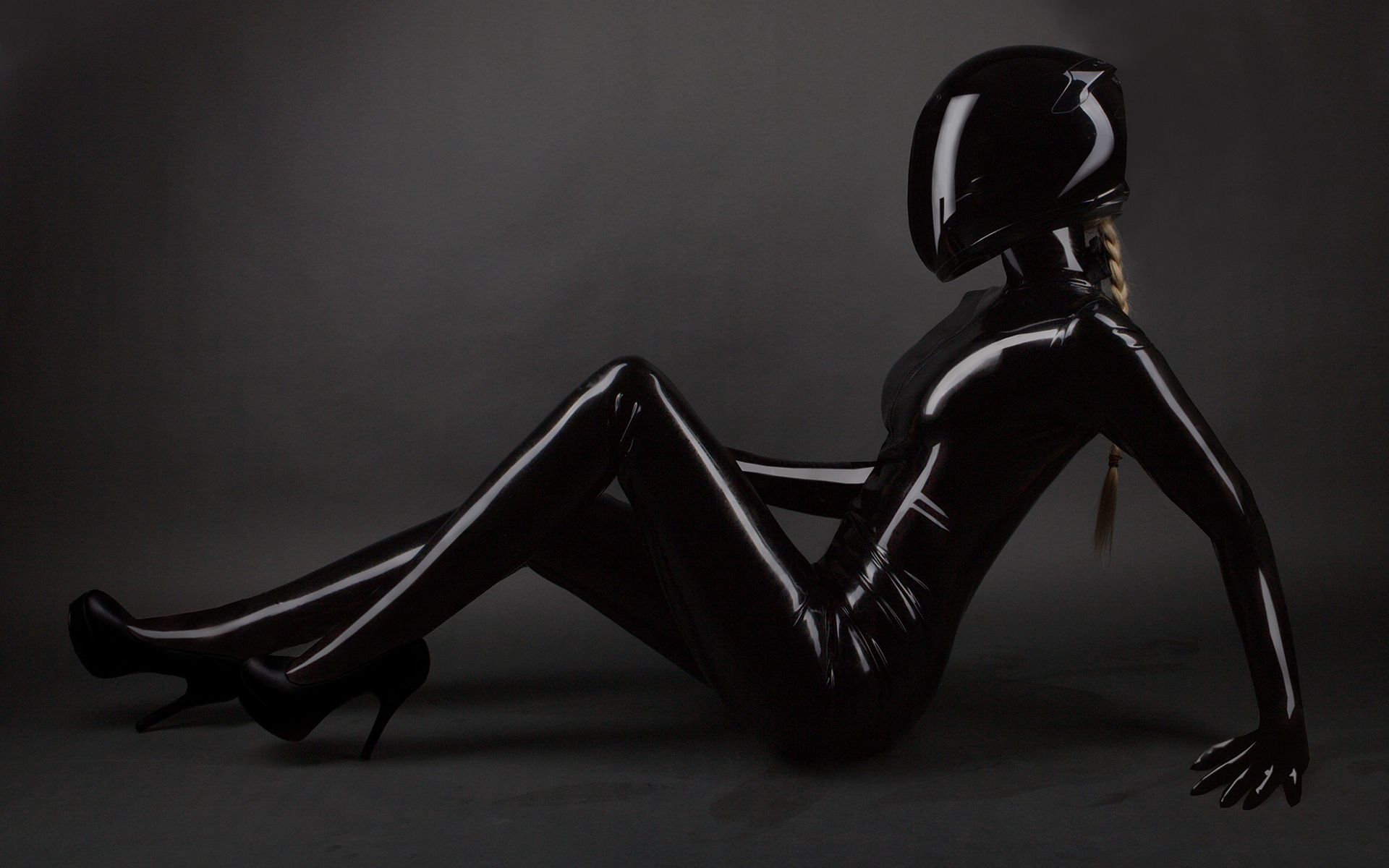 Description: A woman in a black latex outfit is sitting on the floor with her legs crossed and her legs crossed.