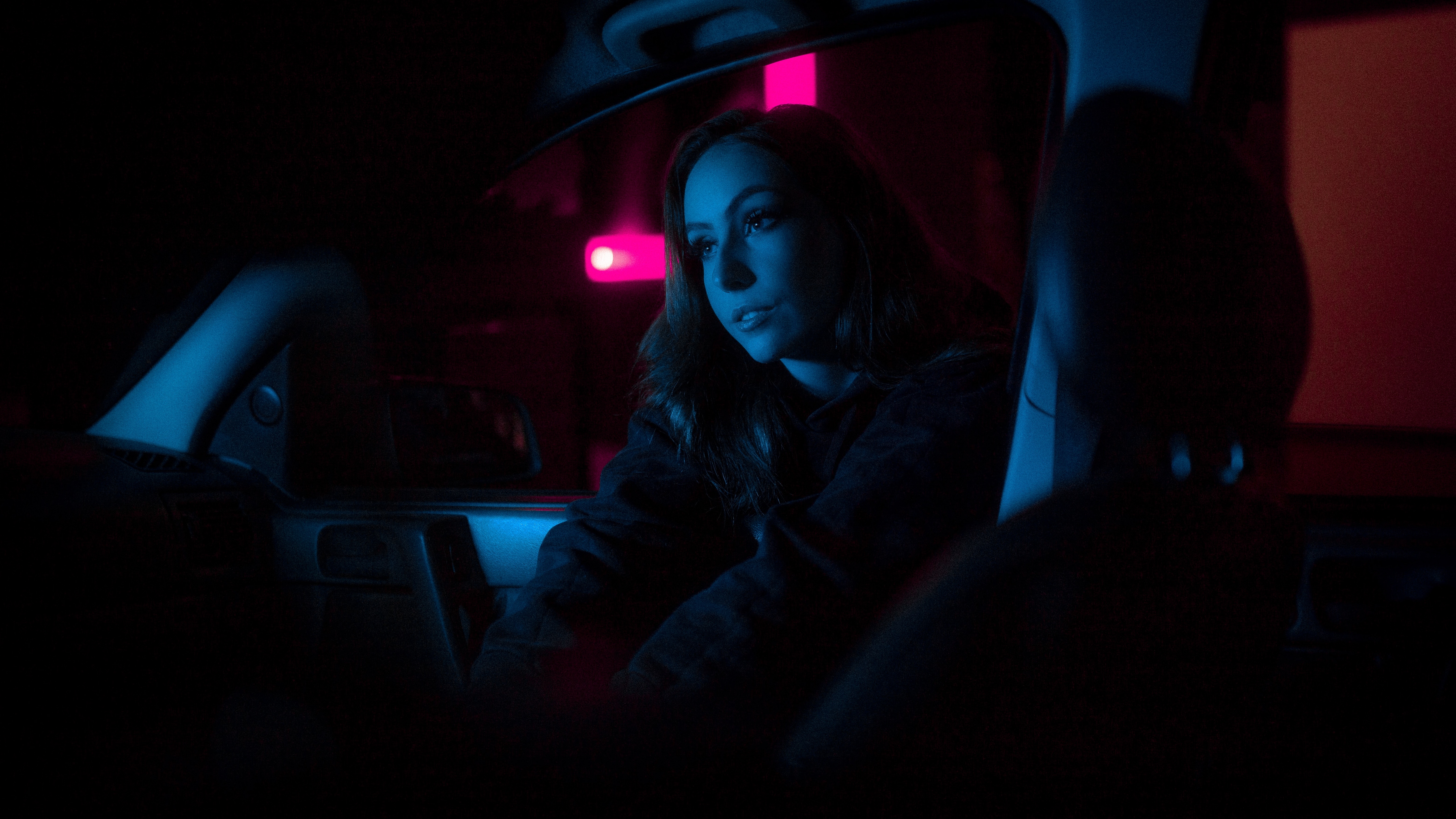 Description: A woman sitting in a car in the dark with a red light on her face and a red light on her head.