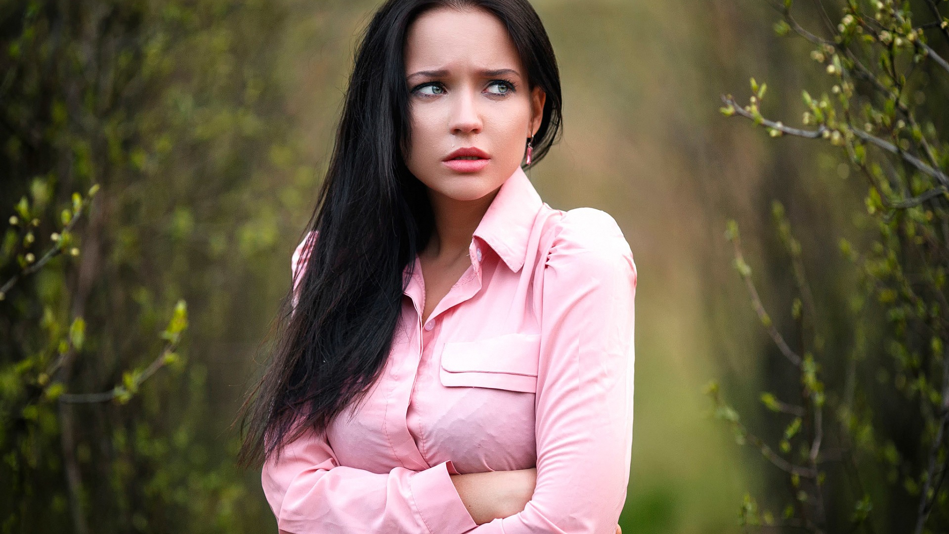 Description: A woman with long hair and a pink shirt is posing for a picture in a forest with her arms crossed.