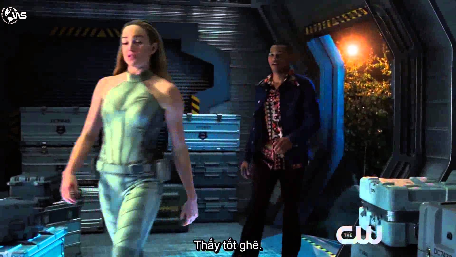 Description: A woman in a white suit walking down a hallway next to a man in a suit and tie and a sci - fi background.
