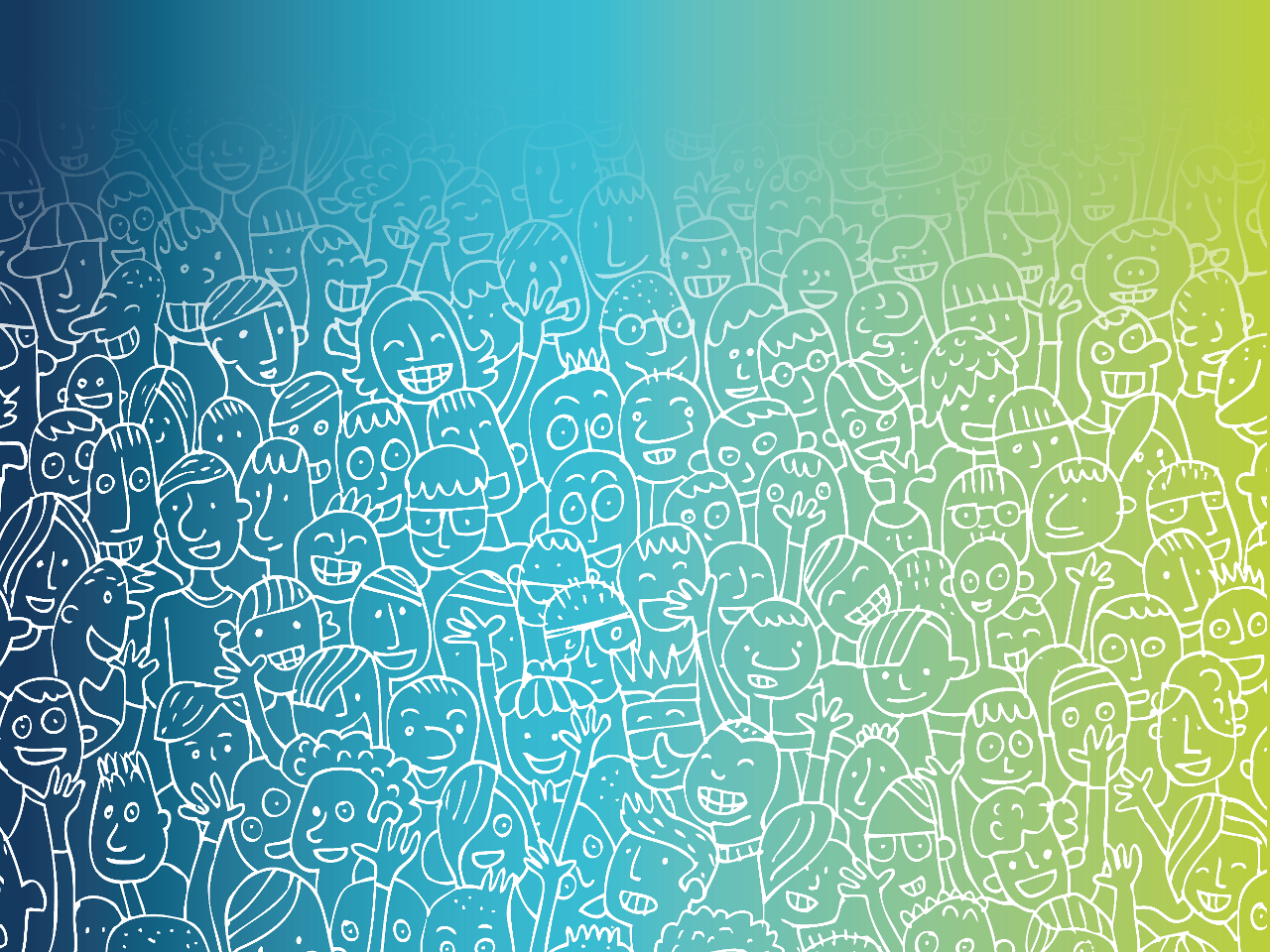 Description: A group of people with faces drawn on them in a rainbow background with a blue and yellow background and a green and blue background.
