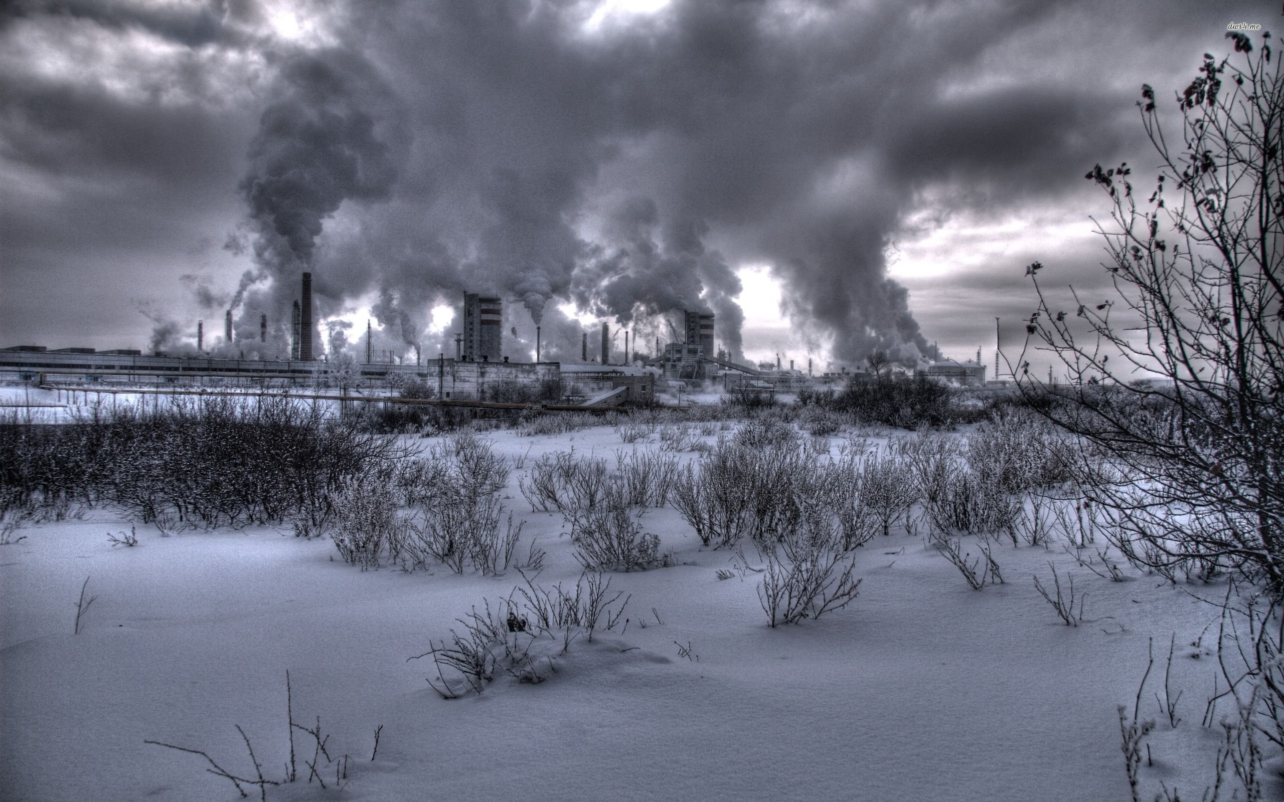 Description: A factory with smoke pouring out of it's stacks in the snow with a cloudy sky above it.