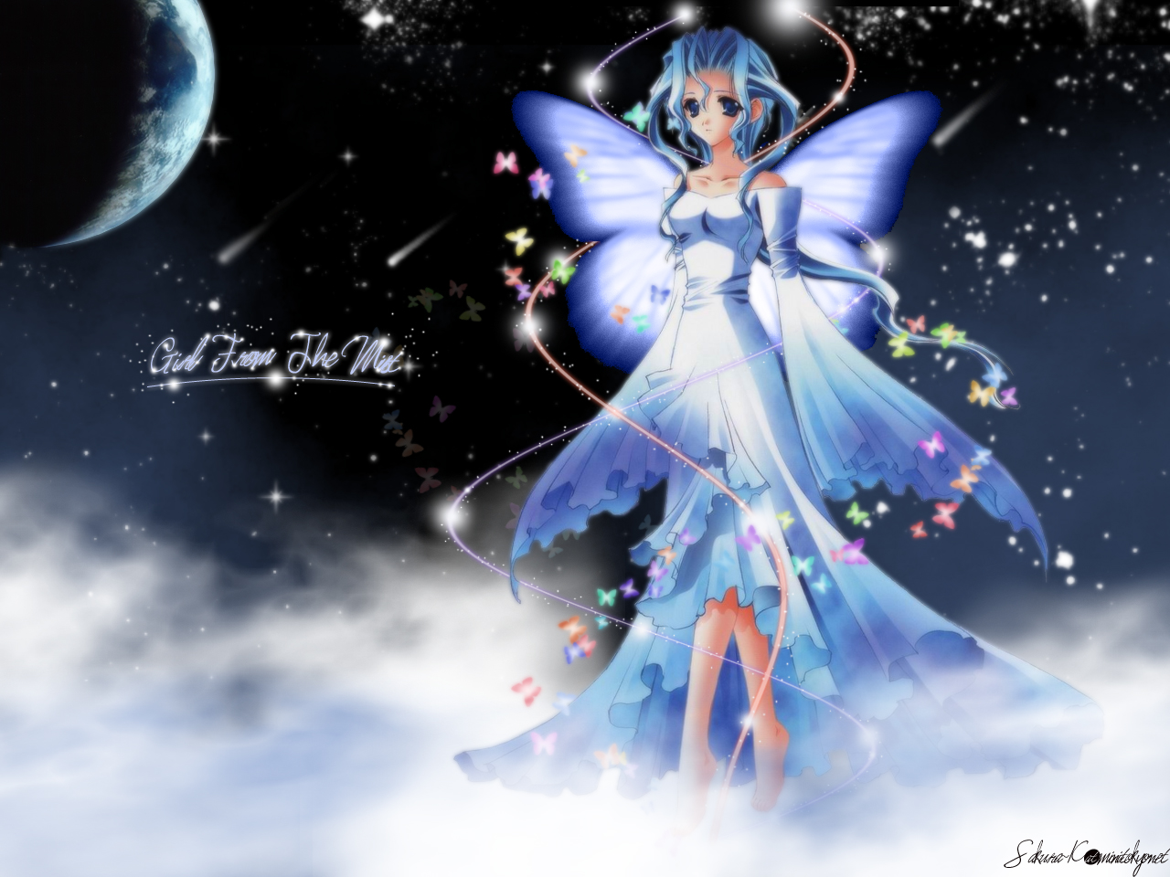 Description: A fairy with a blue dress and stars on her wings is standing in the clouds with a full moon behind her.
