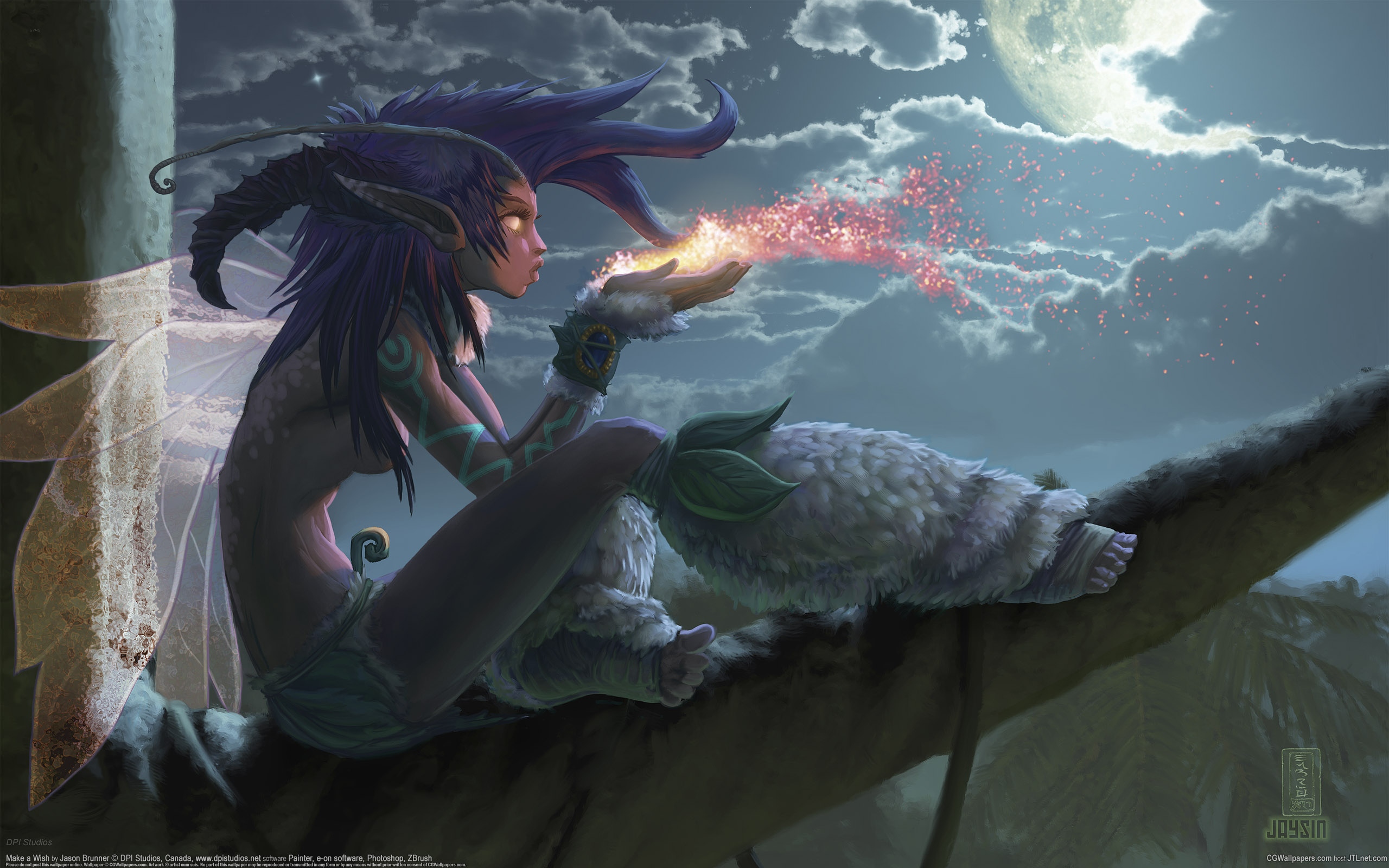 Description: A fairy sitting on a branch with a firework in her hand and a sheep in her lap.