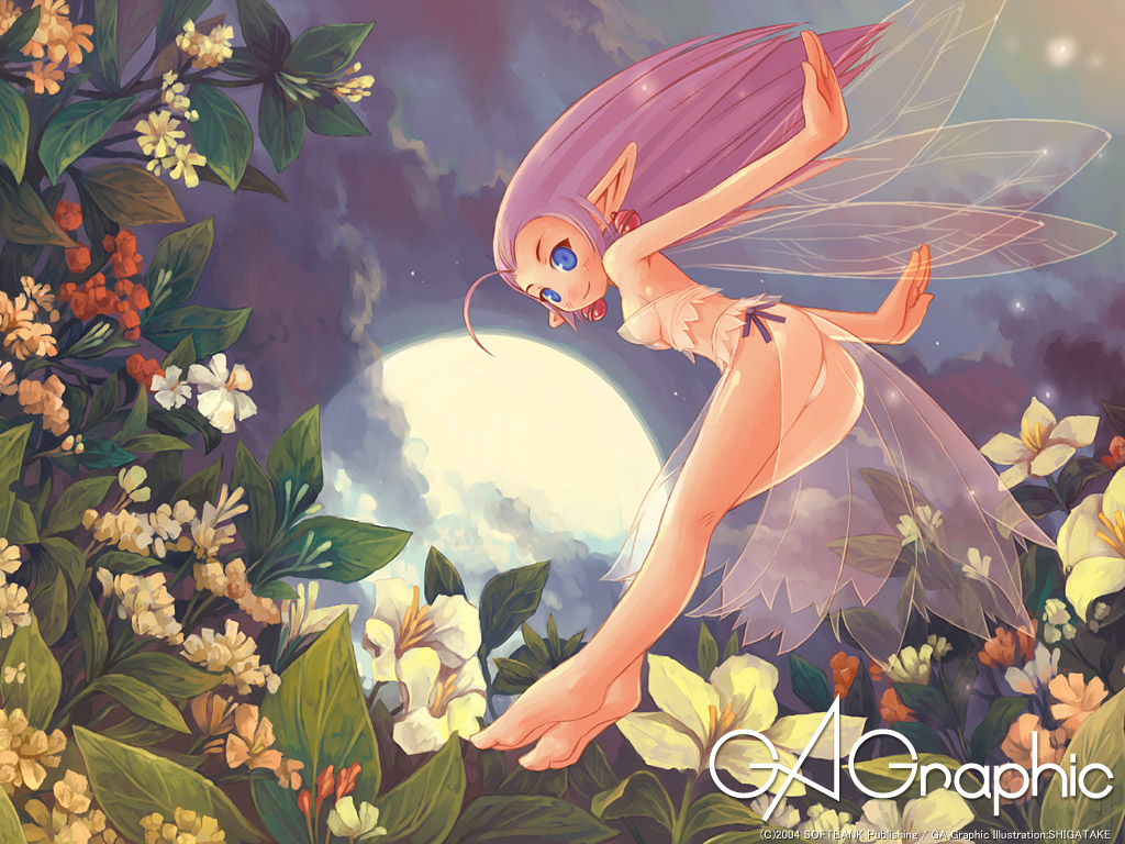 Description: A fairy with a purple hair and a pink tail is flying over flowers and a full moon in the background.