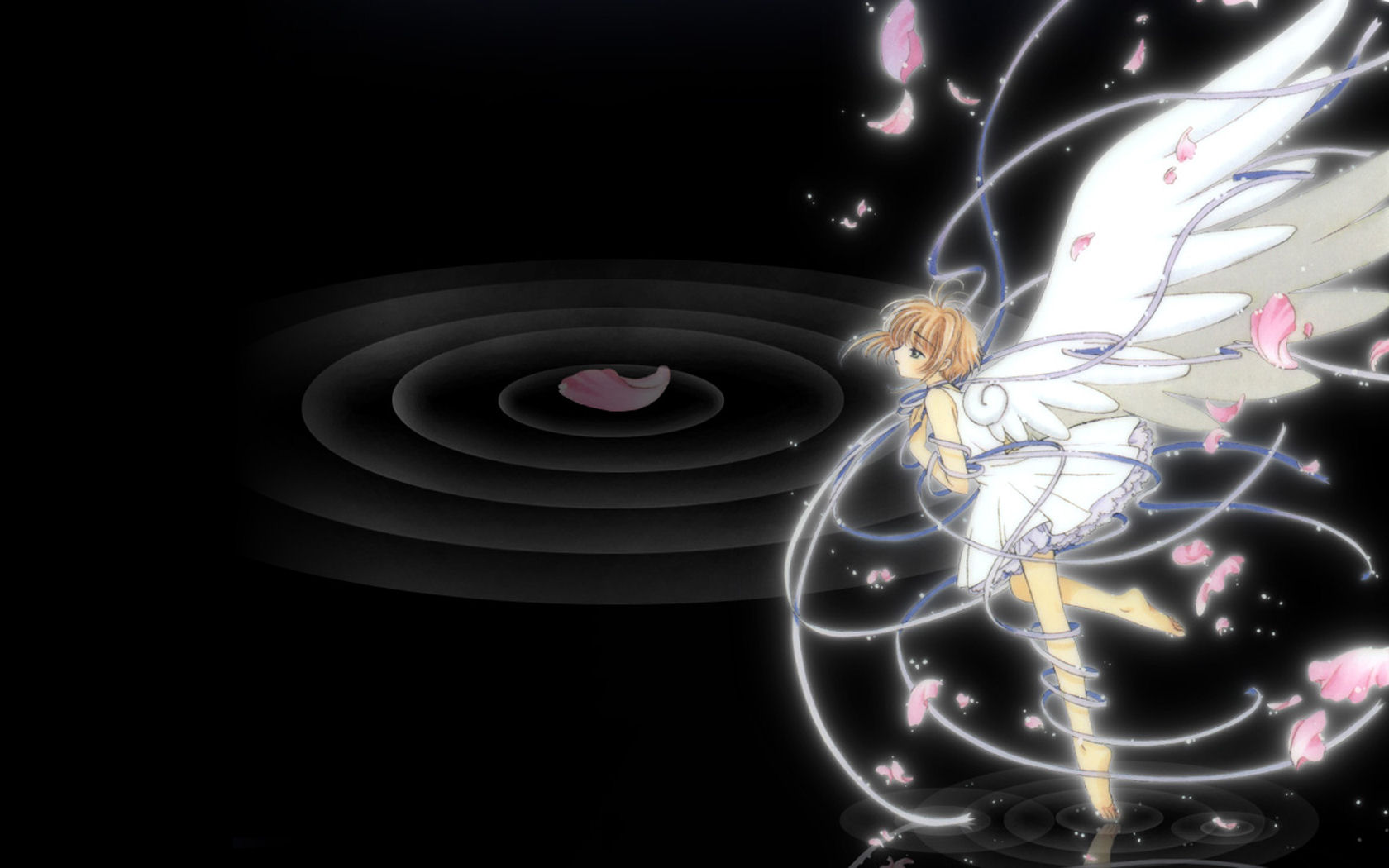 Description: A fairy with a white dress and wings flying through the air with pink petals on her body and a black background.