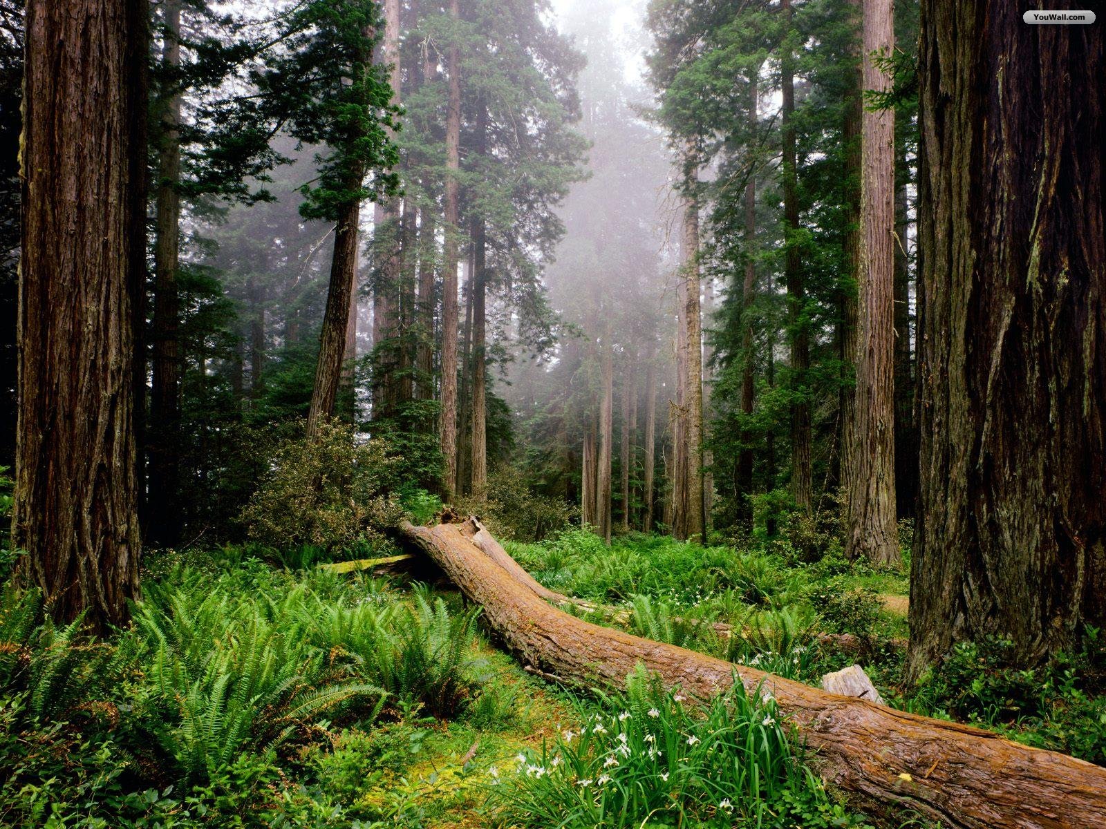 Description: A fallen tree in a forest with fog in the background and a fallen log in the foreground with a trail in the foreground.