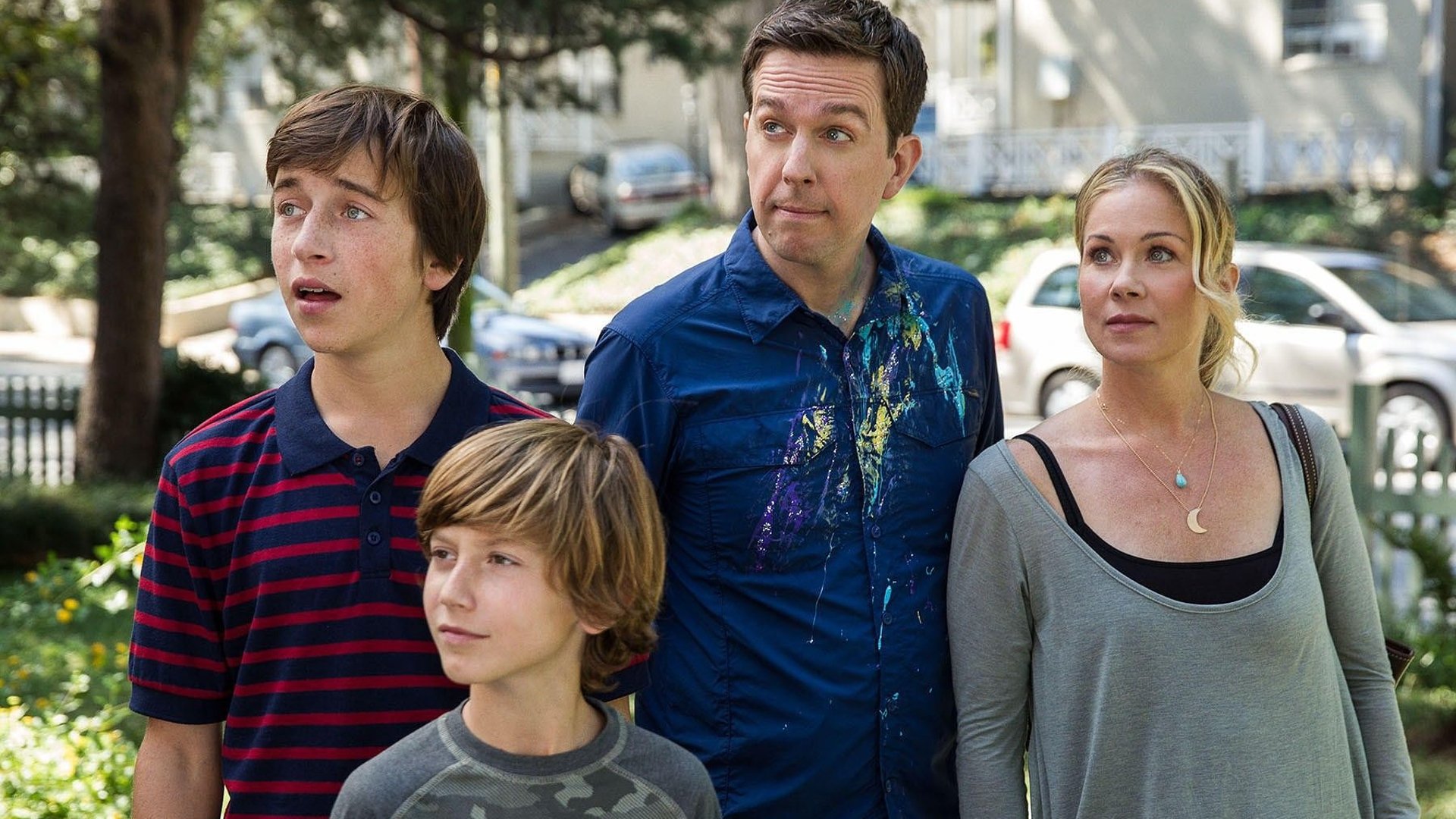 Description: A family standing in a park with cars in the background and a man making a face at the camera.