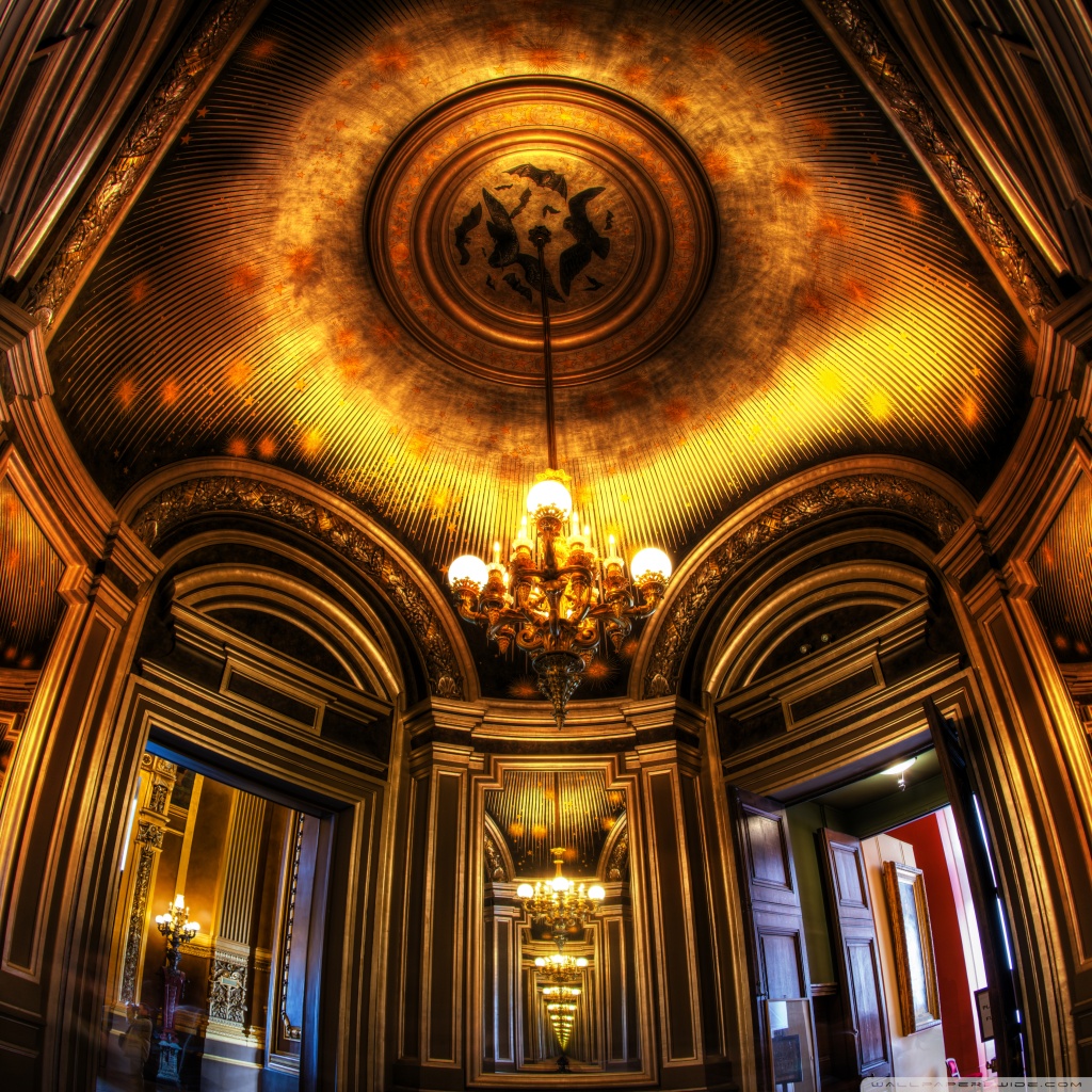 Description: A fancy room with a chandelier and a chandelier hanging from the ceiling and a chandelier hanging from the ceiling.
