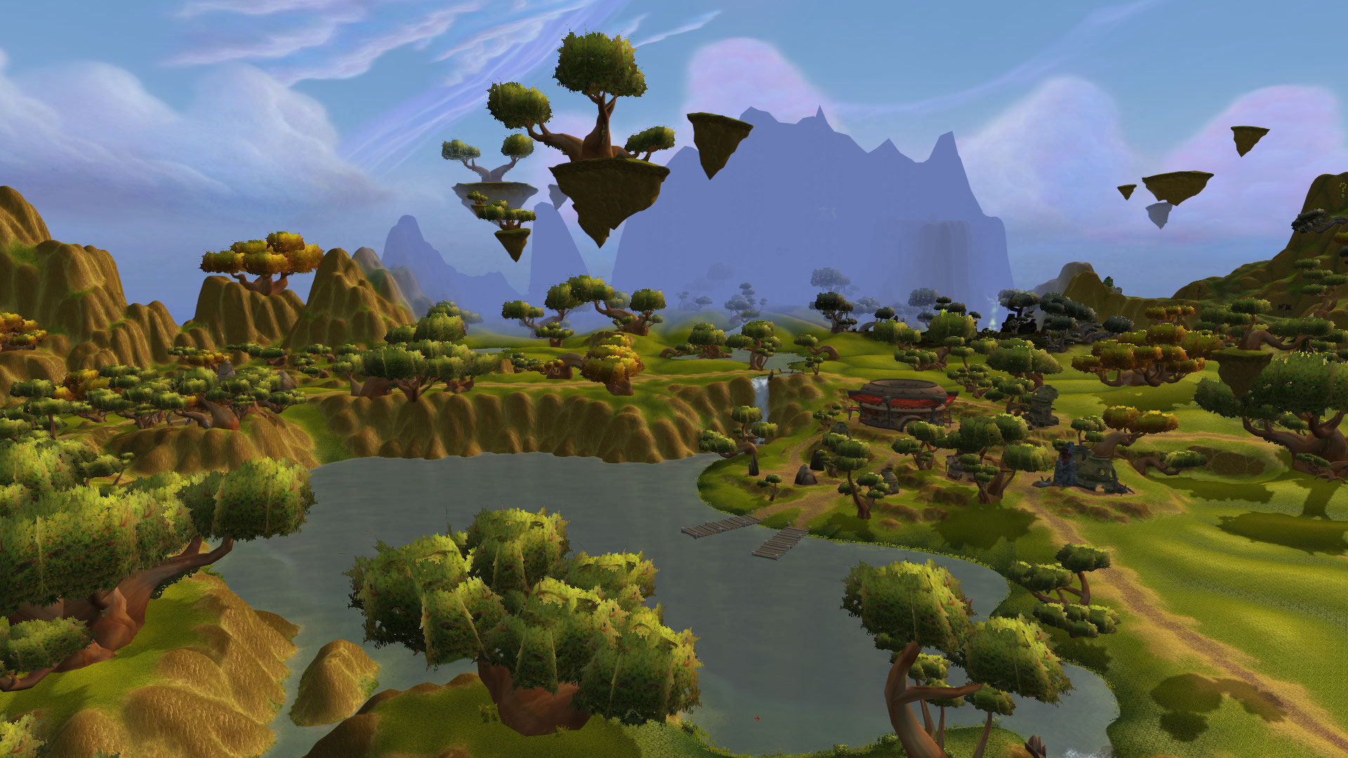 Description: A computer generated landscape with a pond and trees in the foreground and mountains in the background.