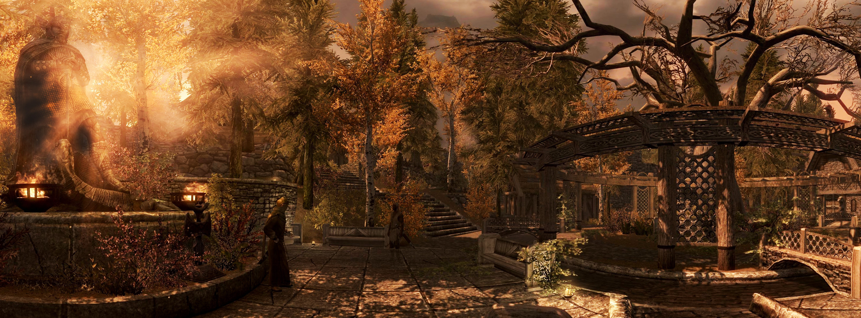 Description: A fantasy scene with a fountain and a statue in the middle of the park with a lot of trees.