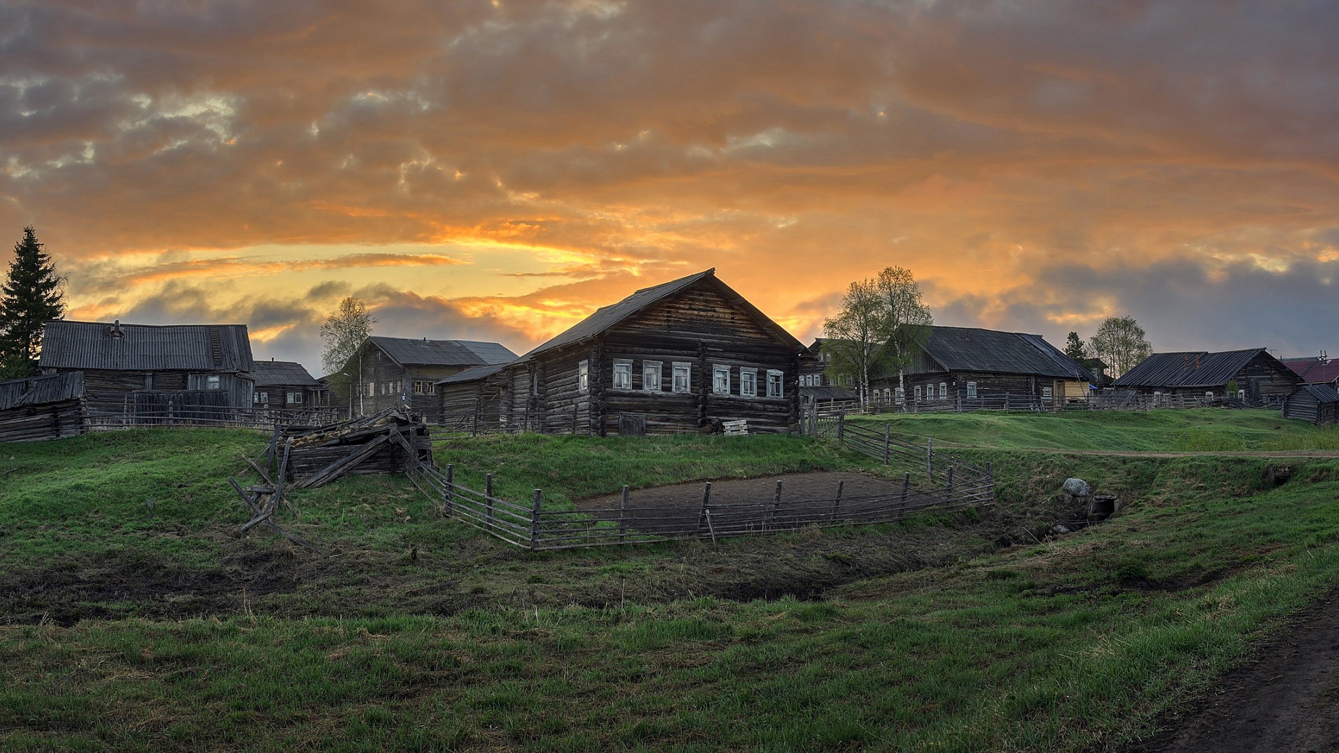 Description: A farm with a fence and a building in the background with a sunset in the sky above it and a few people walking on the grass.