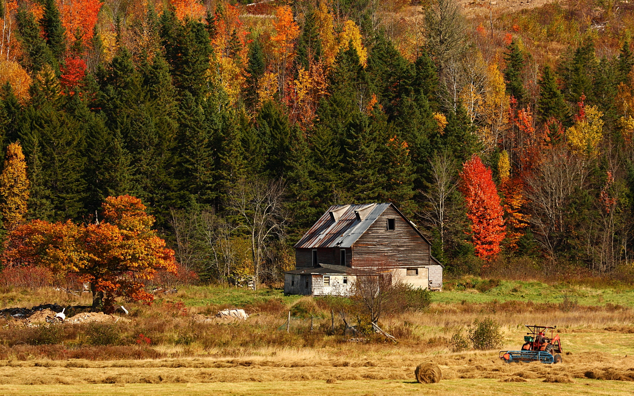 Description: A farm house in the middle of a field with a tractor in front of it and trees in the background.