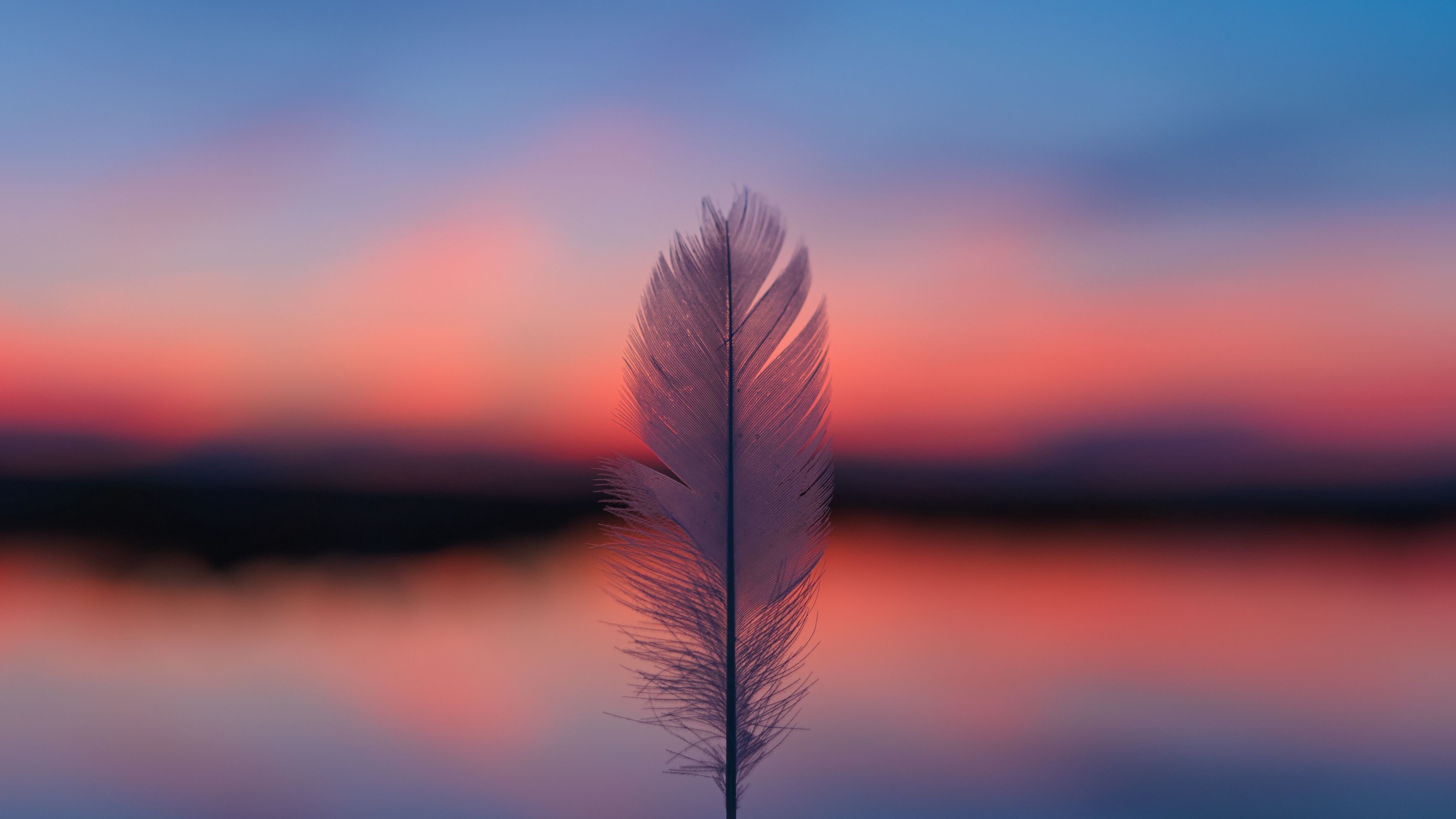 Description: A feather is sitting on a table in front of a lake at sunset or dawn with a pink and blue sky.