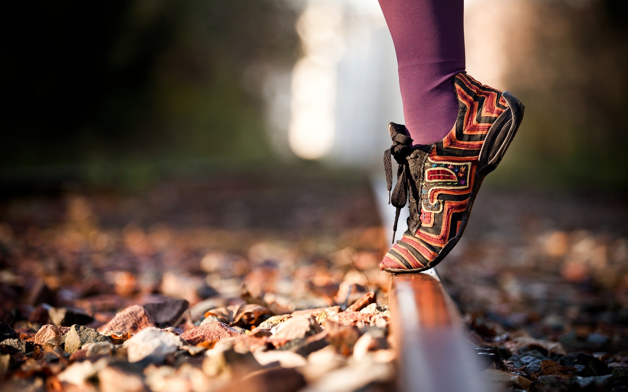 Description: A person's feet in a pair of shoes on a trail of leaves and rocks in the woods.