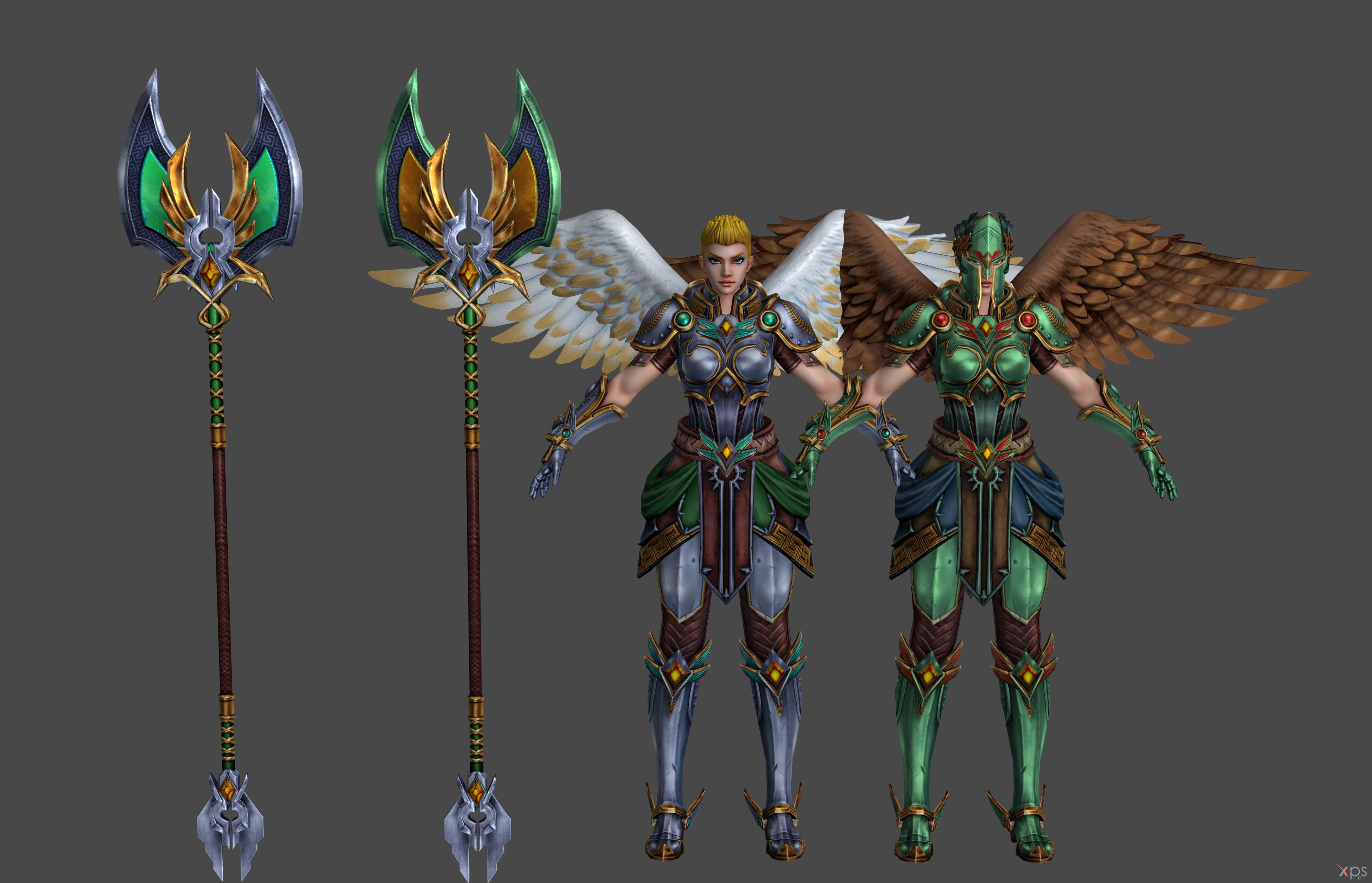 Description: A set of three different types of female armor and weapons.