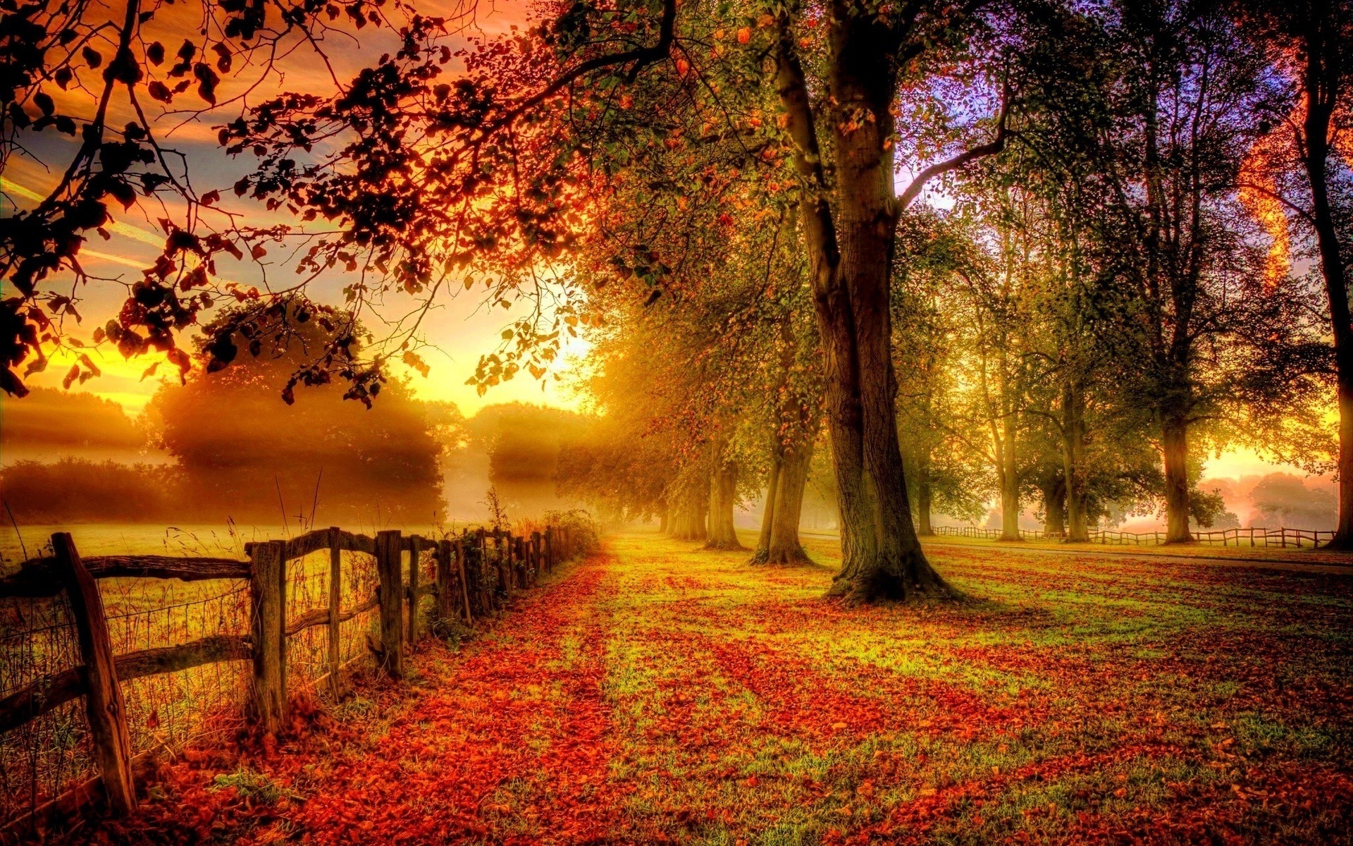 Description: A fence in a field with trees and grass in the background and a sunset in the background with a fog.