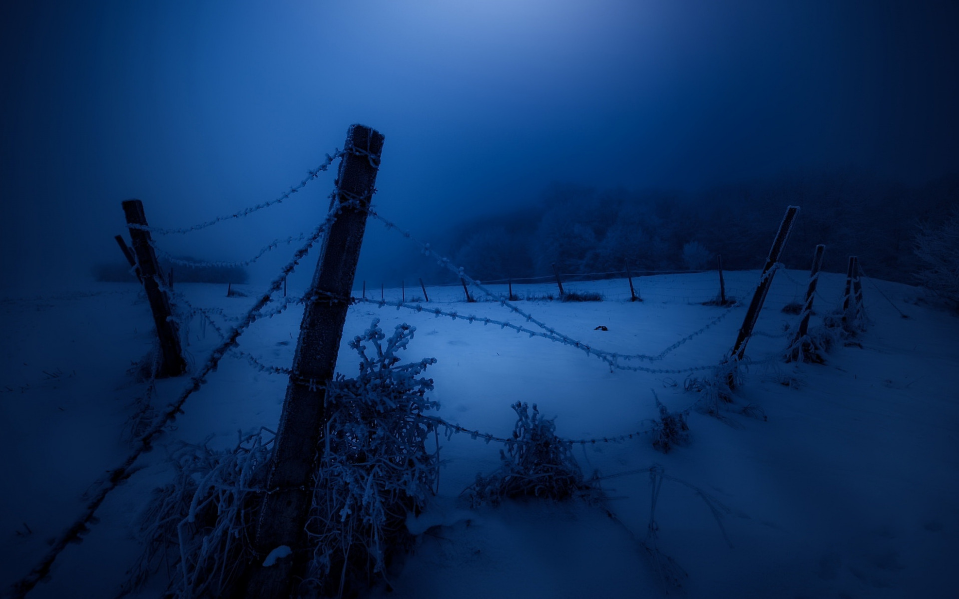 Description: A fence in the snow with a full moon in the background and a foggy sky above it.