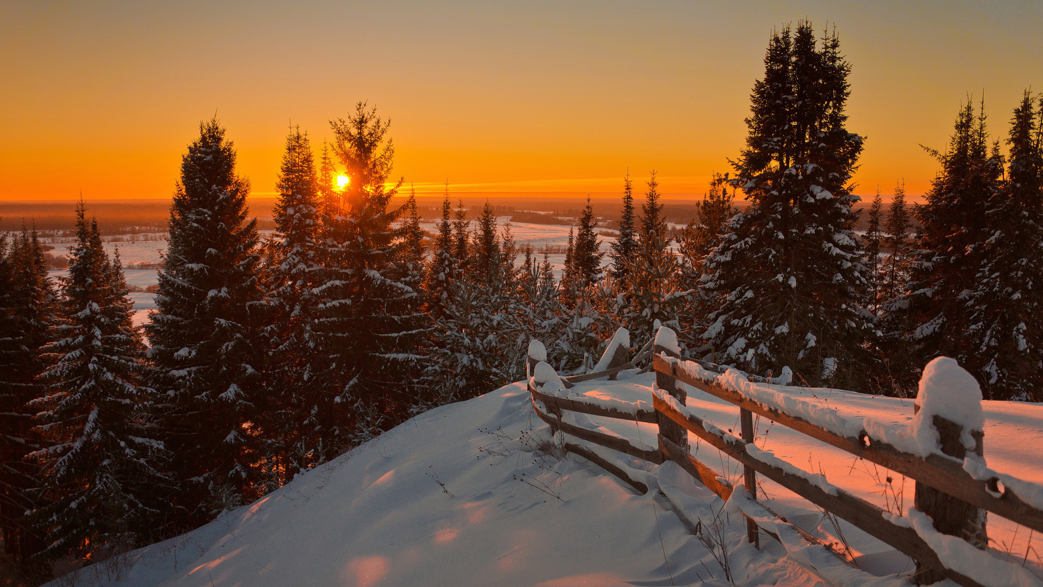 Description: A fence in the snow with the sun setting in the background and trees in the foreground.