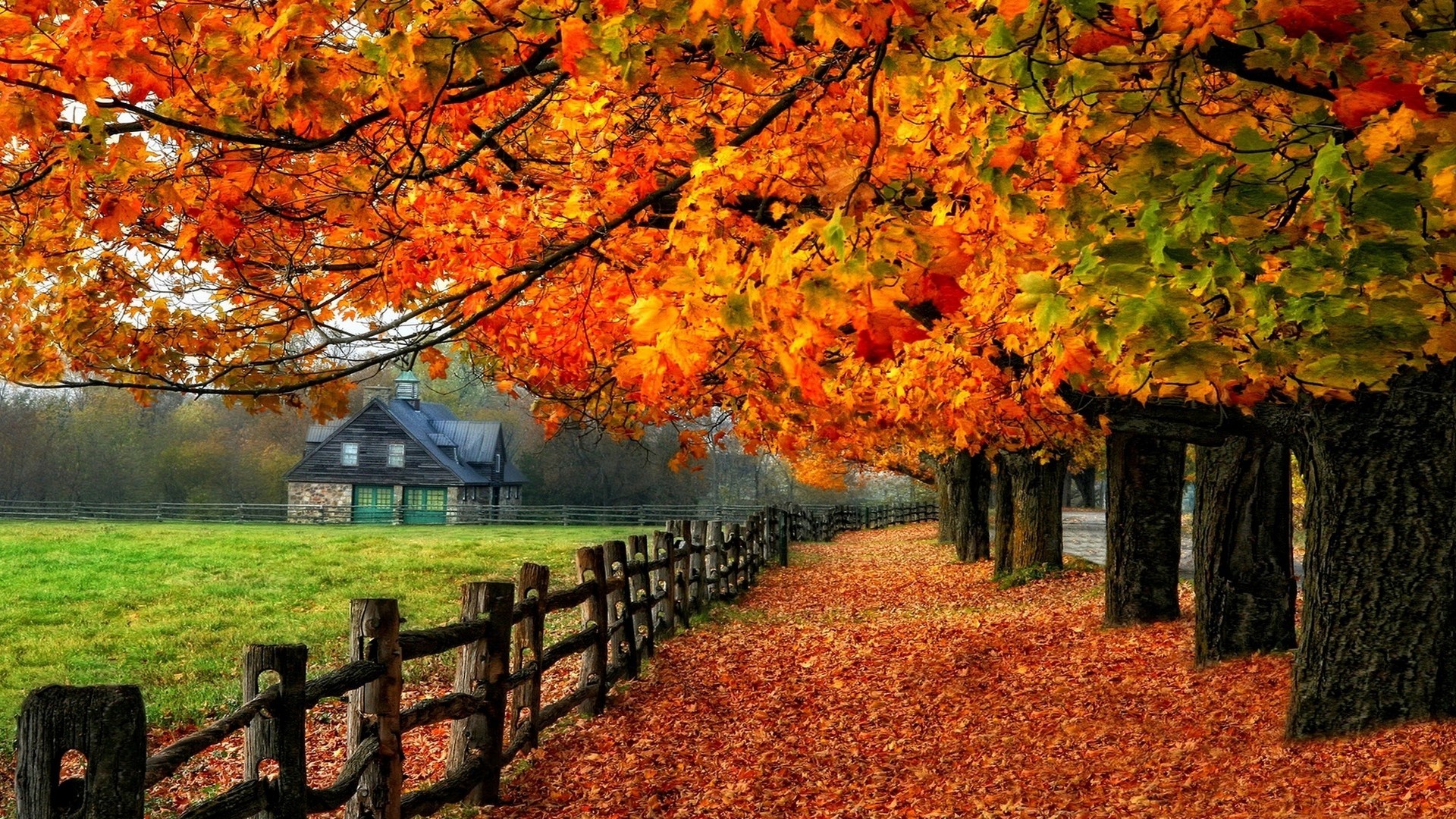 Description: A fence with a wooden post and a tree with leaves on it and a house in the background with a green field and trees with orange leaves.