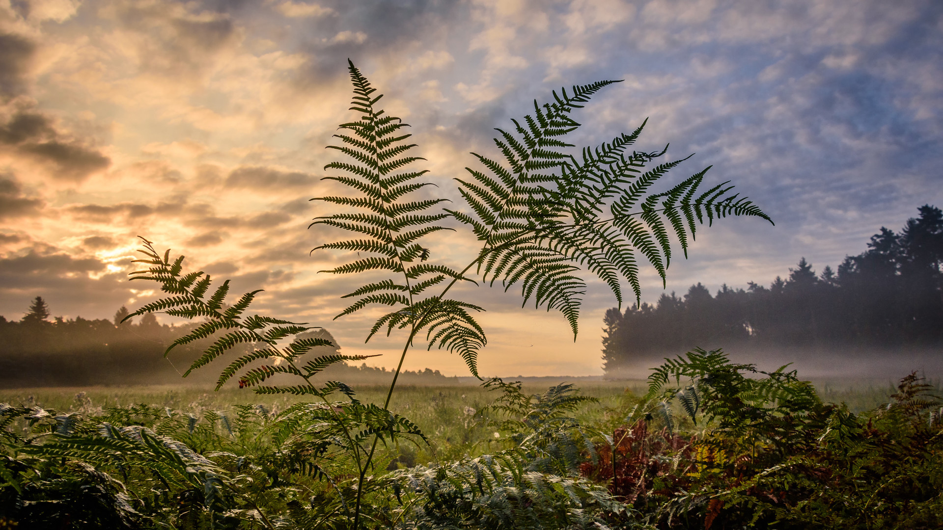Description: A fern tree in a field with a sunset in the background and clouds in the sky above it.