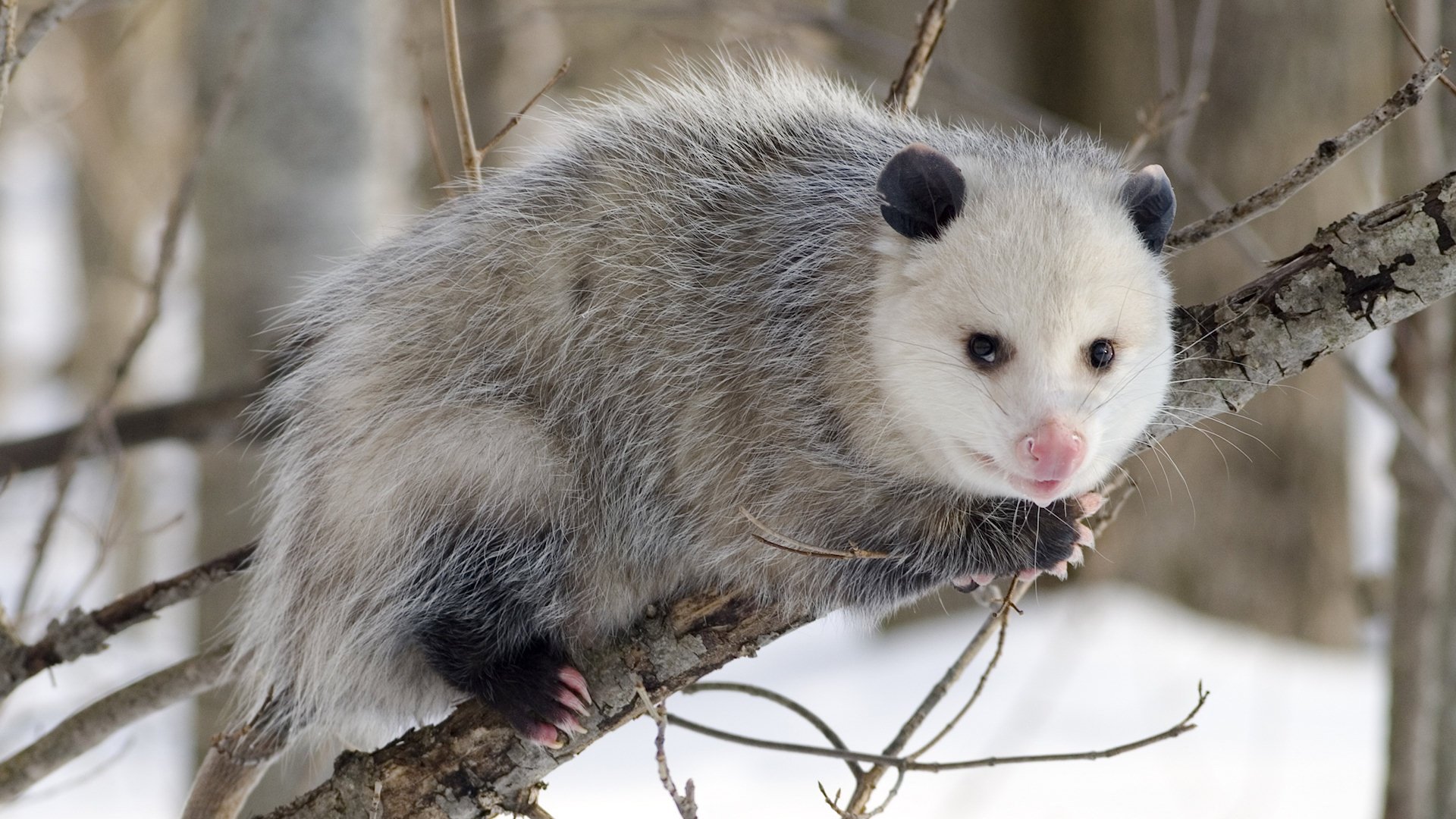 Description: A ferret is sitting on a tree branch in the snow.