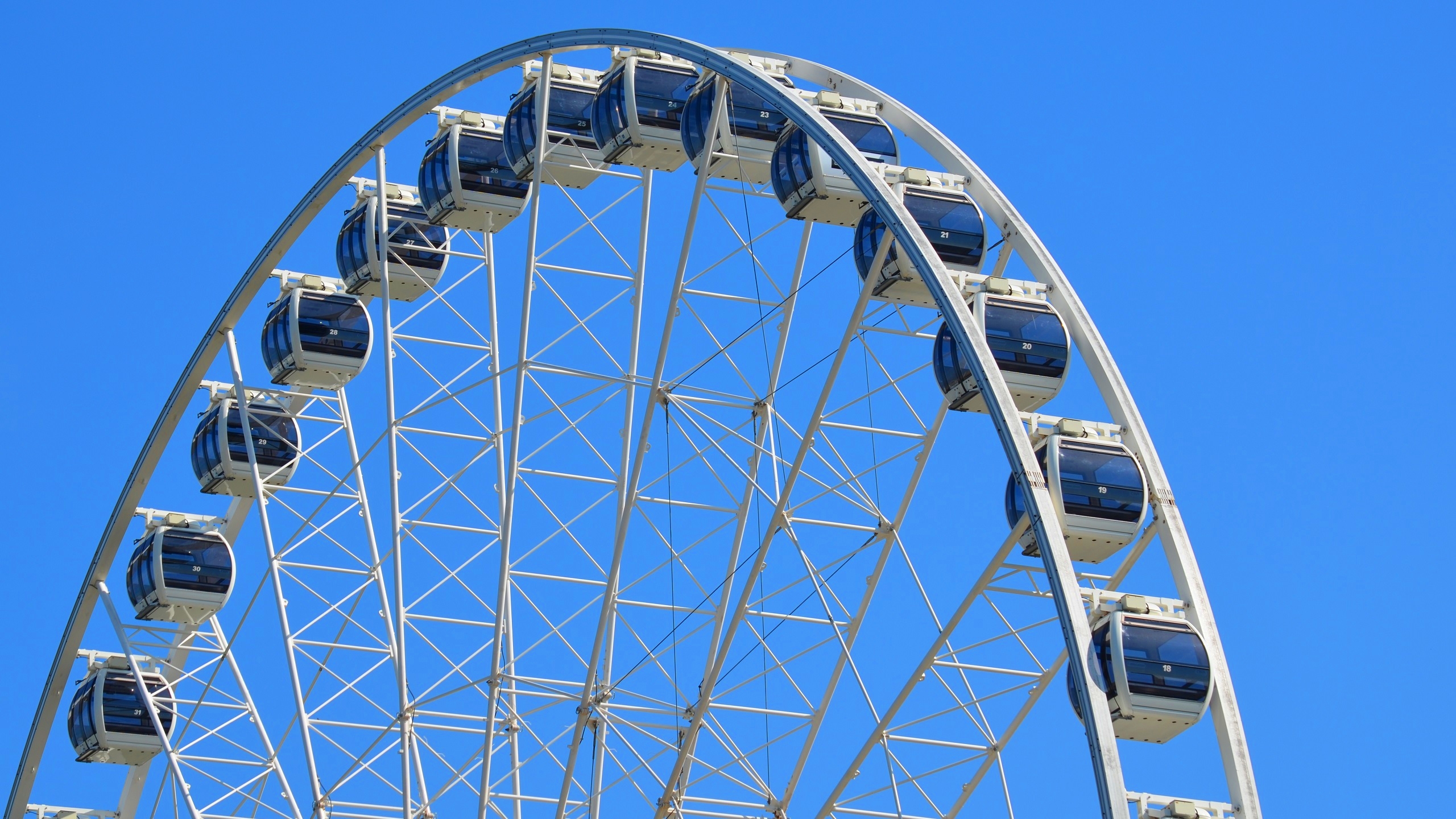 Description: A ferris wheel with blue sky in the background and a blue sky in the background with no clouds in sight.