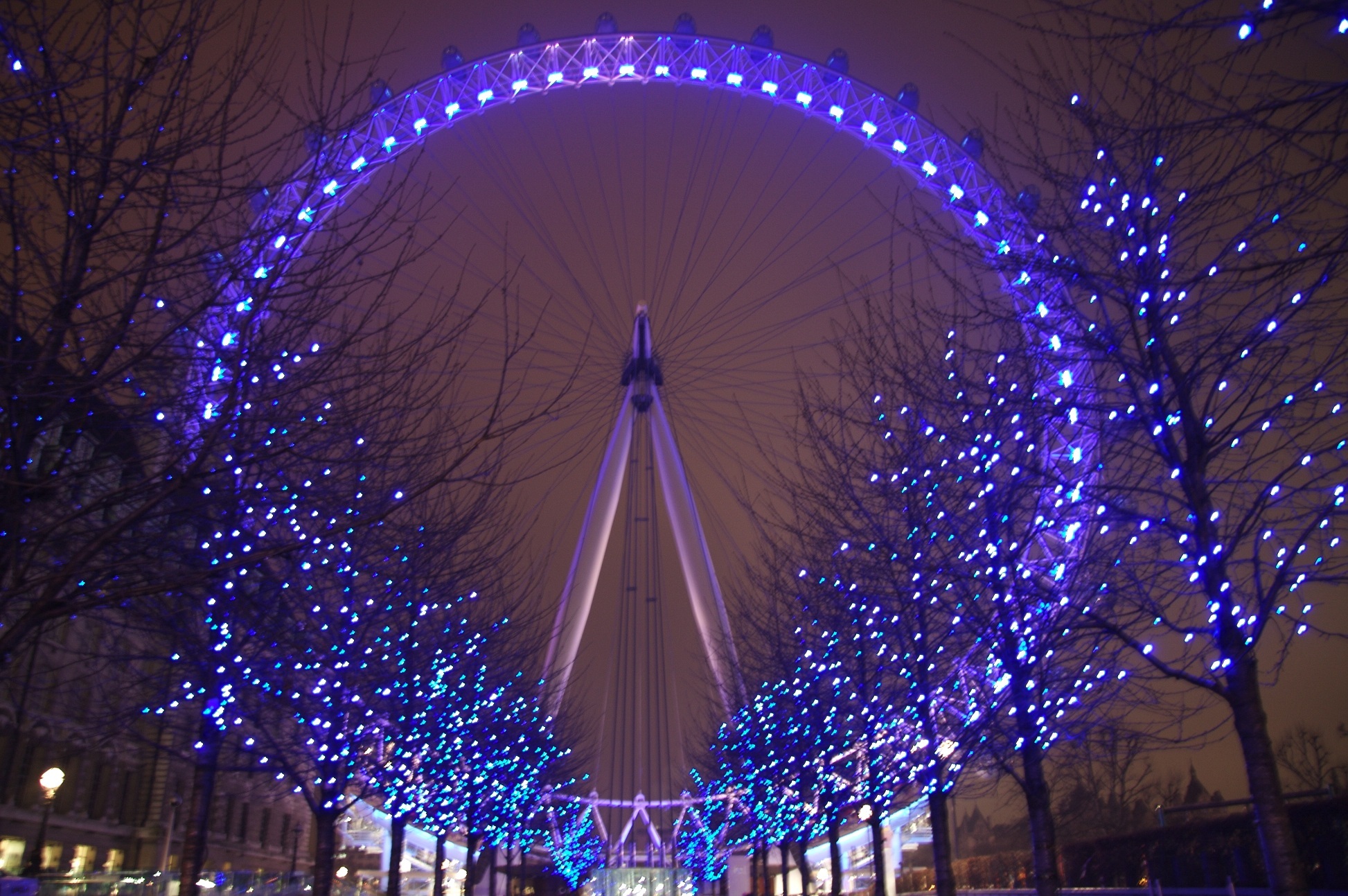 Description: A ferris wheel lit up at night with trees and lights around it and people walking around the area around it.