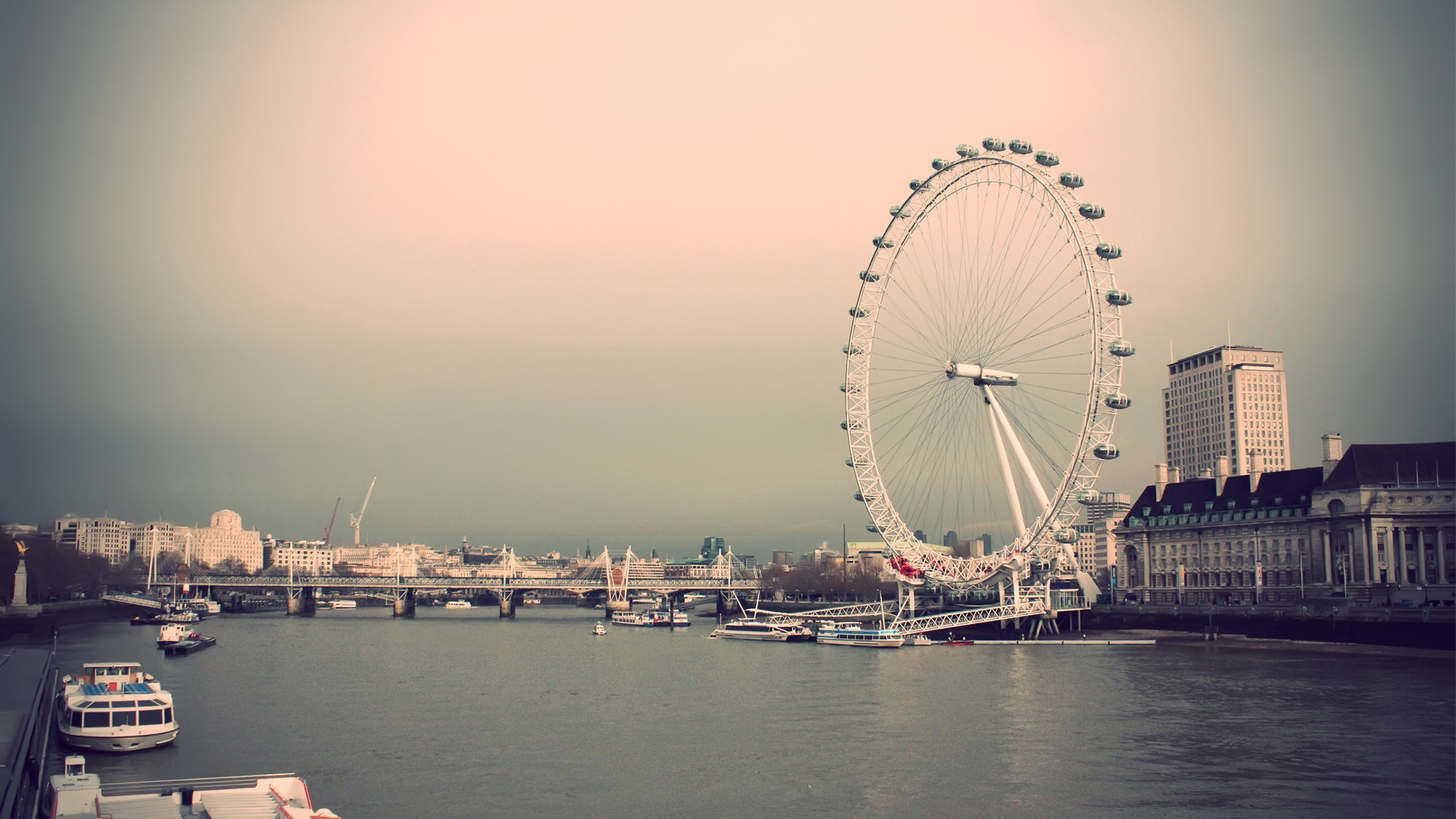 Description: A ferris wheel is shown in the distance of a river with boats in it and a bridge in the background.