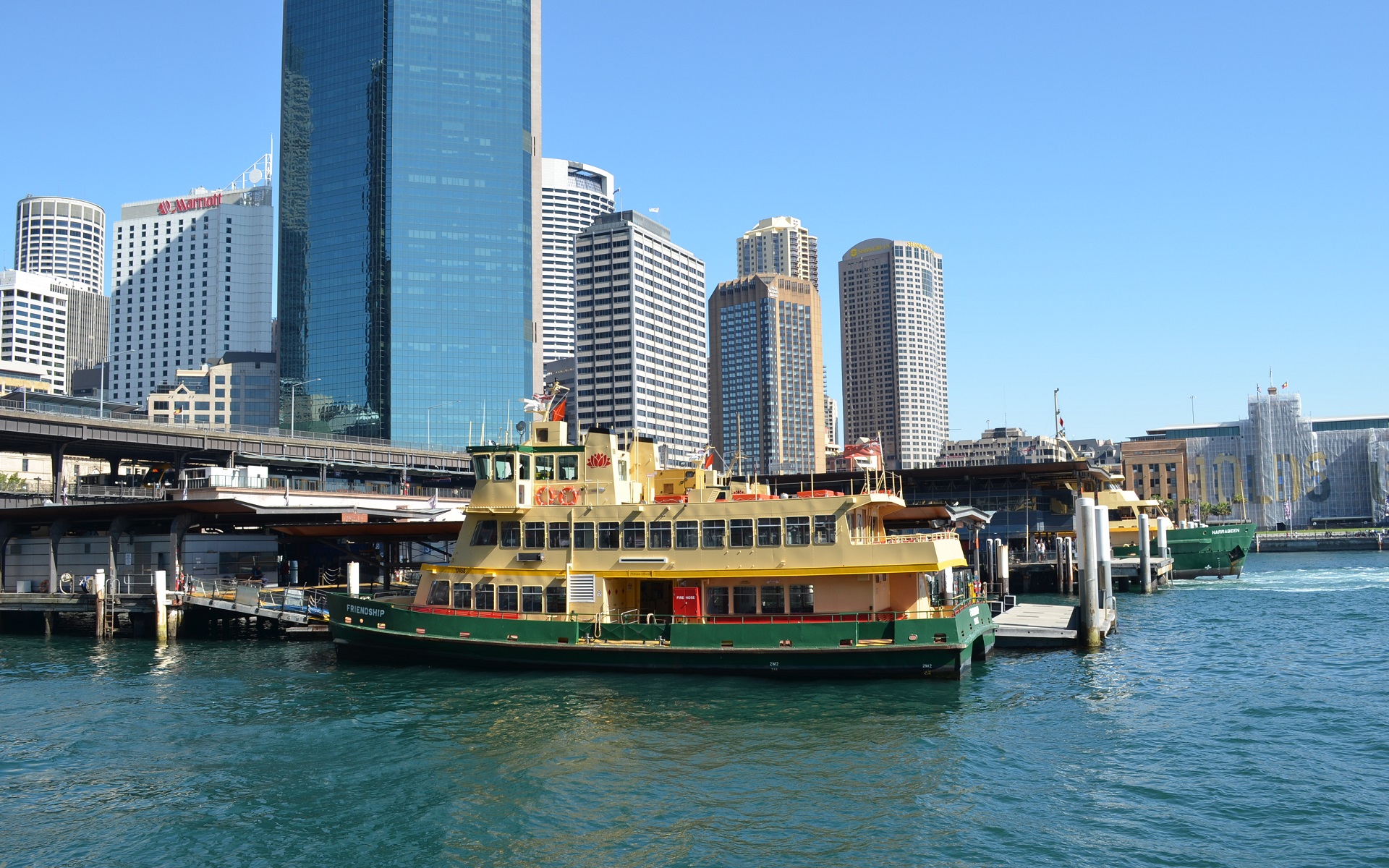 Description: A ferry boat is docked in the water near a city skyline with skyscrapers in the background.