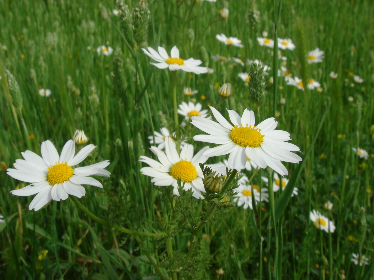 Description: A field of white daisies with yellow centers in the middle of the grass.