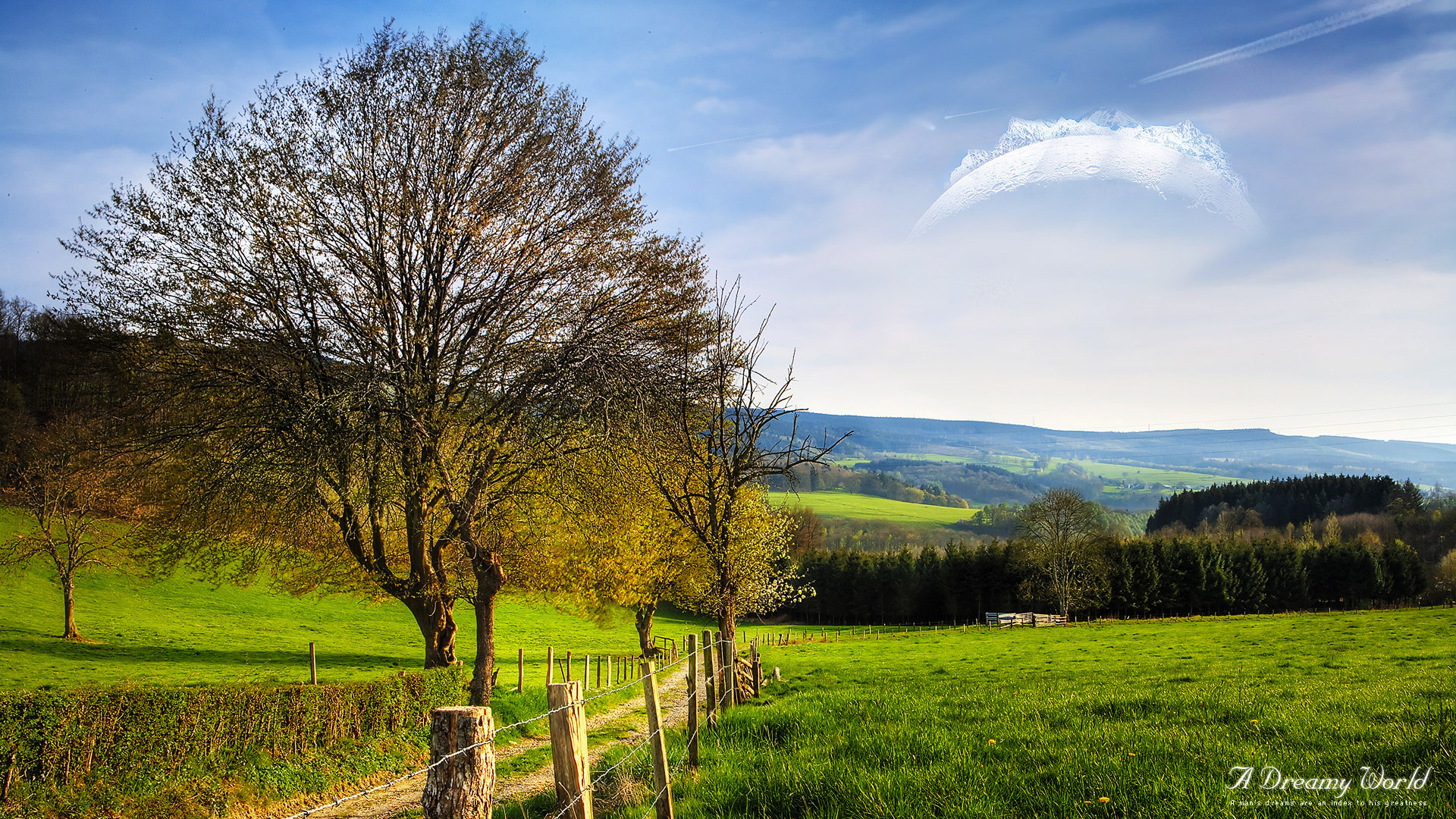 Description: A field with a fence and a tree in the foreground and a distant object in the distance in the distance.