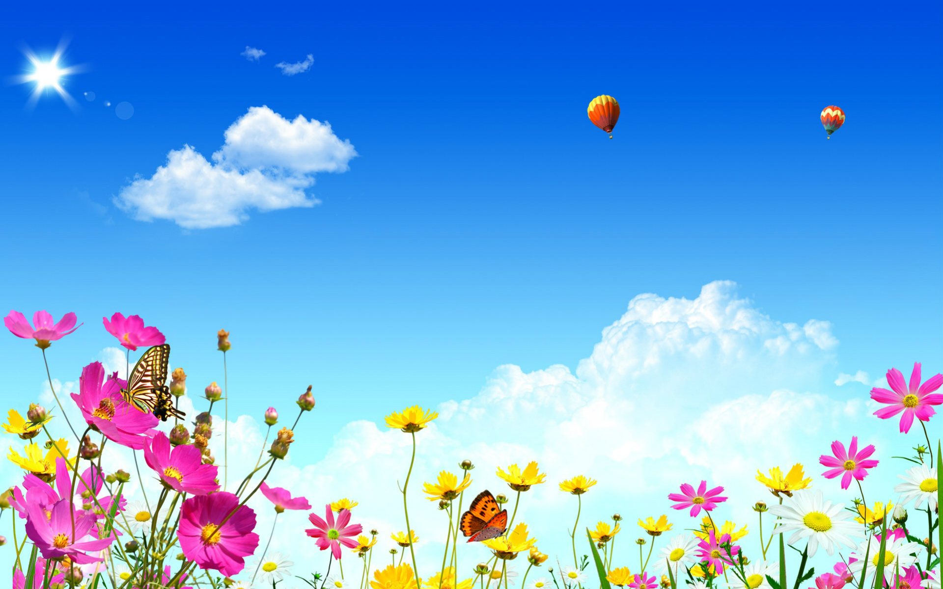 Description: A field of flowers with a butterfly flying over it and a bright blue sky with clouds in the background.