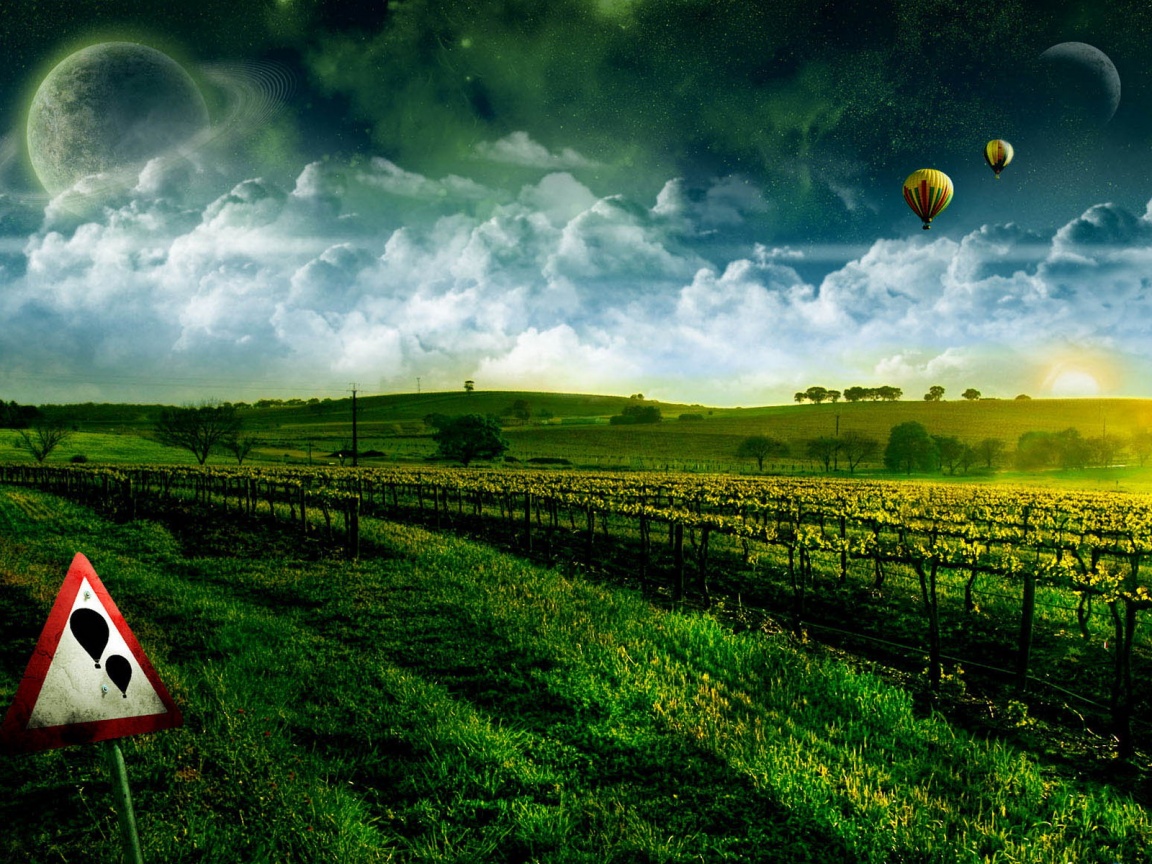 Description: A field with a sign and hot air balloons in the sky above it and a field with a sign in the foreground.