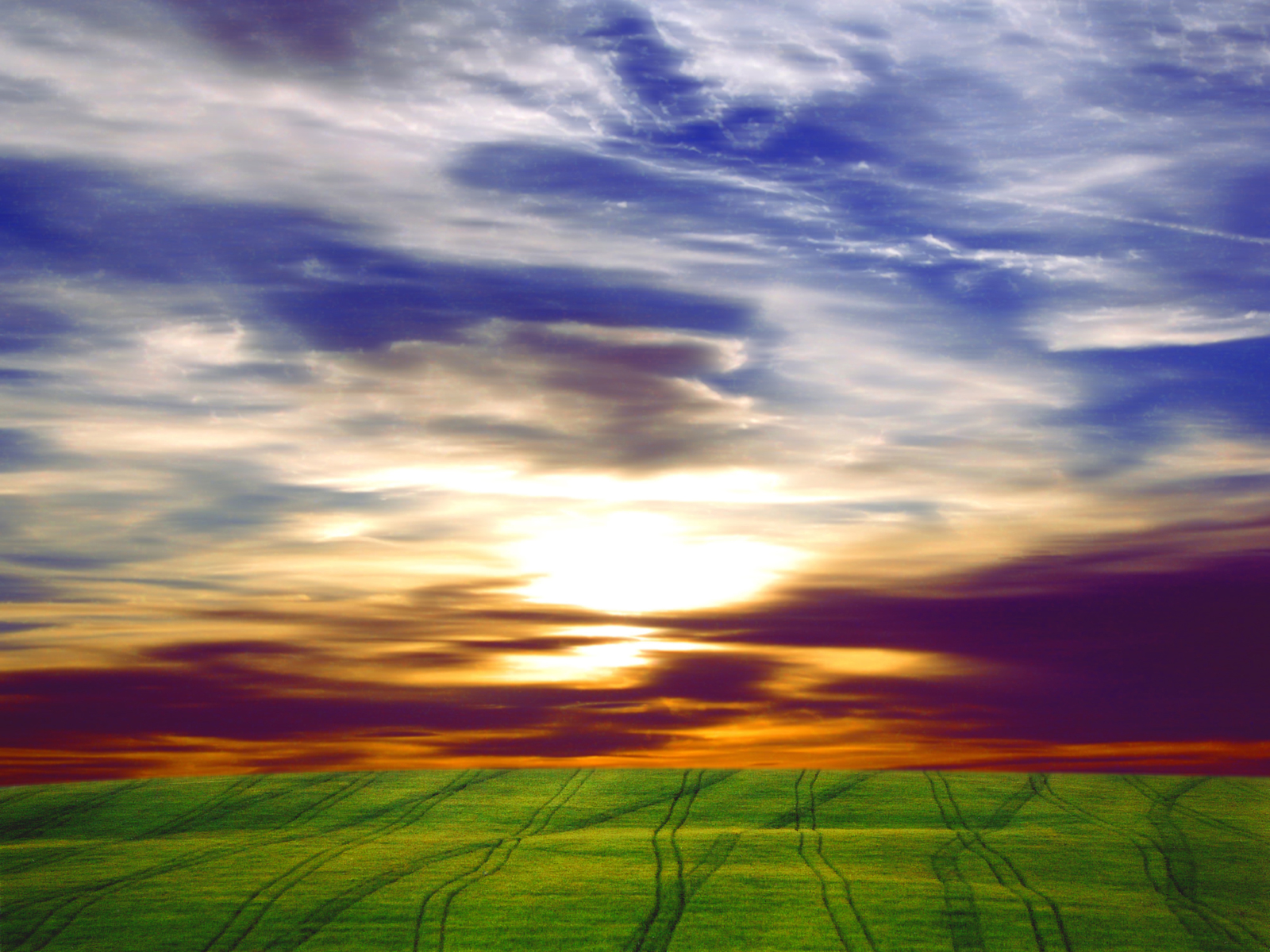 Description: A field with a sky filled with clouds and a sun setting in the distance behind it with a horse in the foreground.