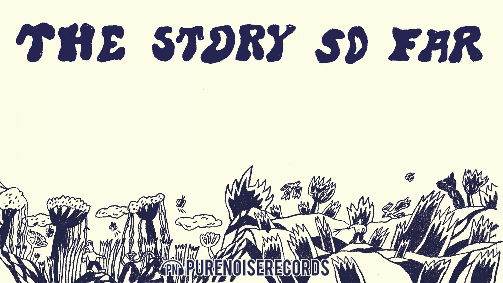 Description: A drawing of a field with trees and bushes in the background and the words the story so far above it.