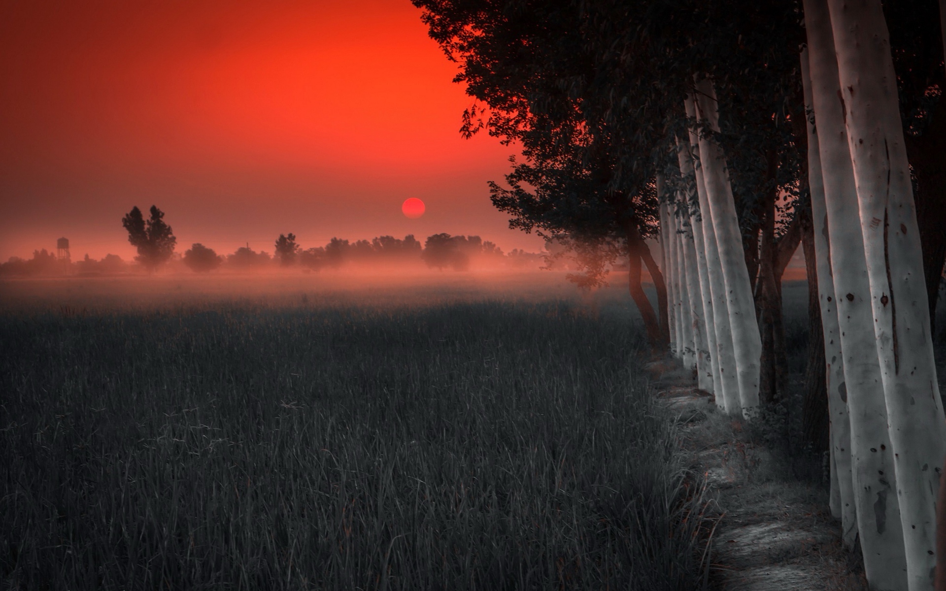 Description: A field with trees and fog at sunset with the sun setting in the distance behind the trees and the sun setting in the distance.