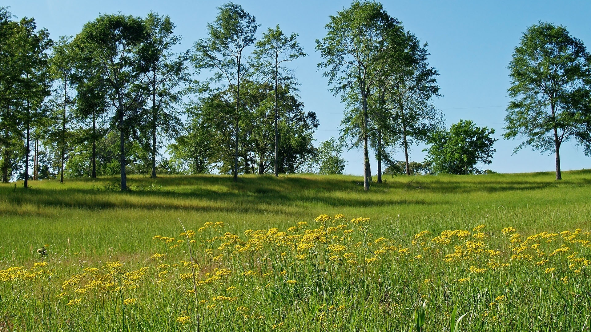 Description: A field with trees and grass in the background and a blue sky in the background with a few clouds.