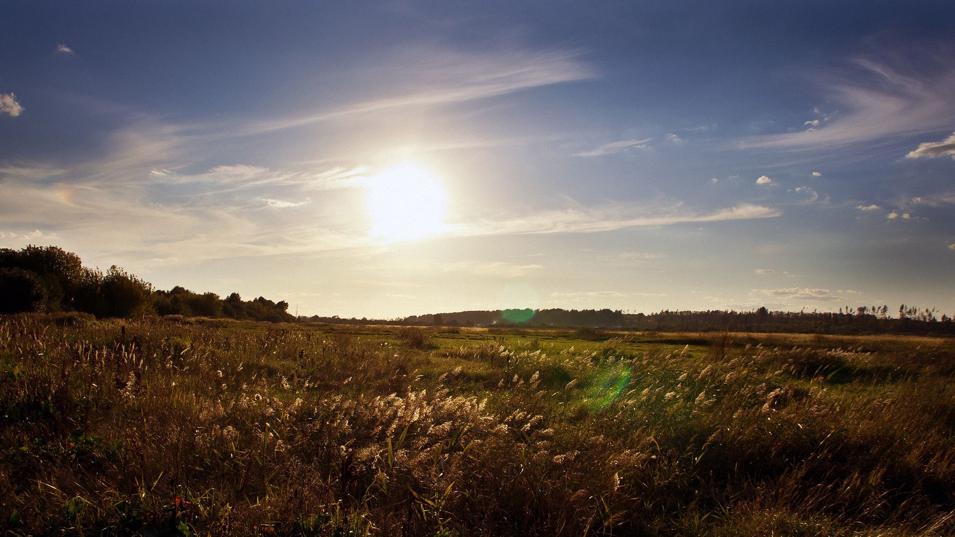 Description: A field with grass and trees and the sun shining through the clouds in the distance with a blue sky.